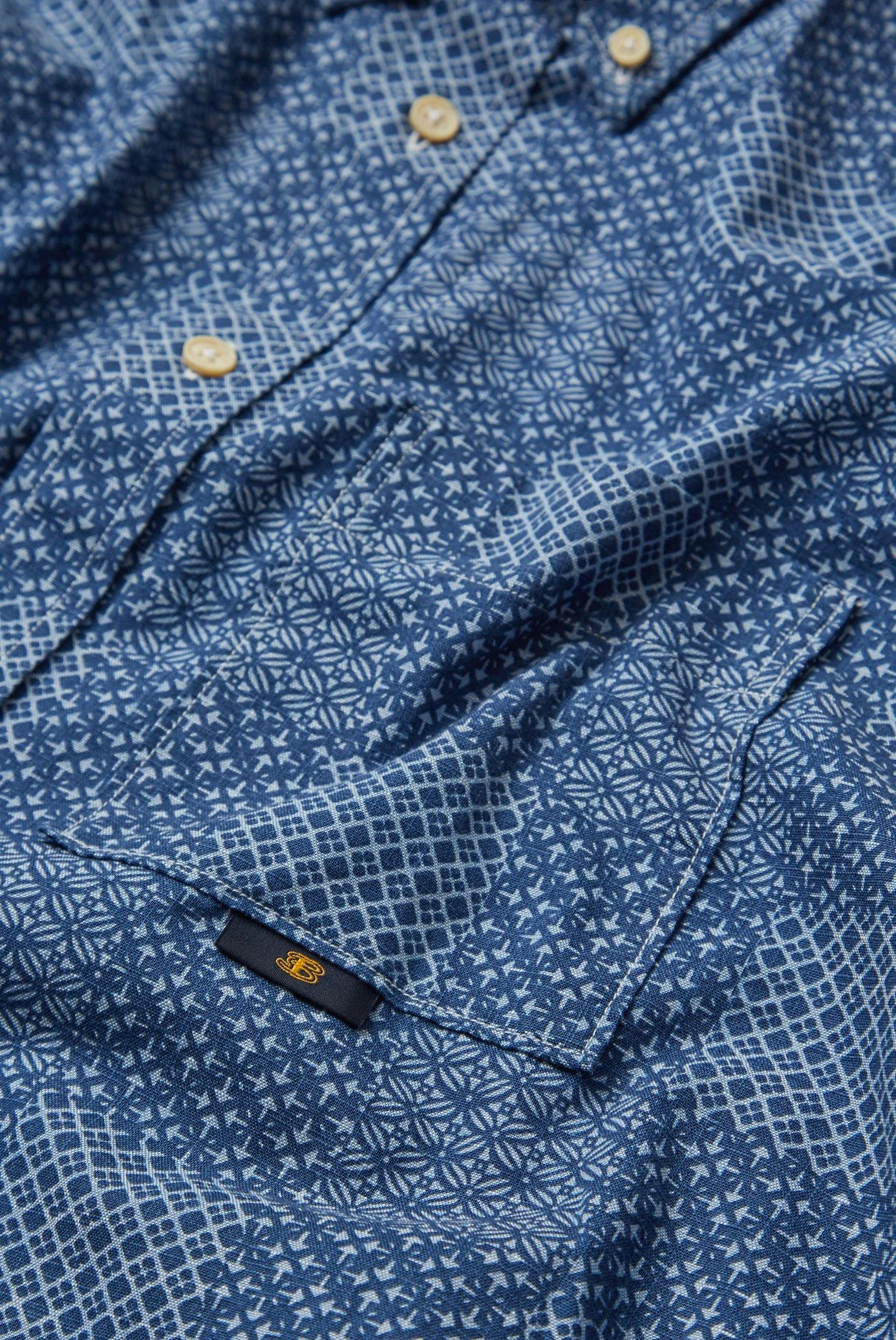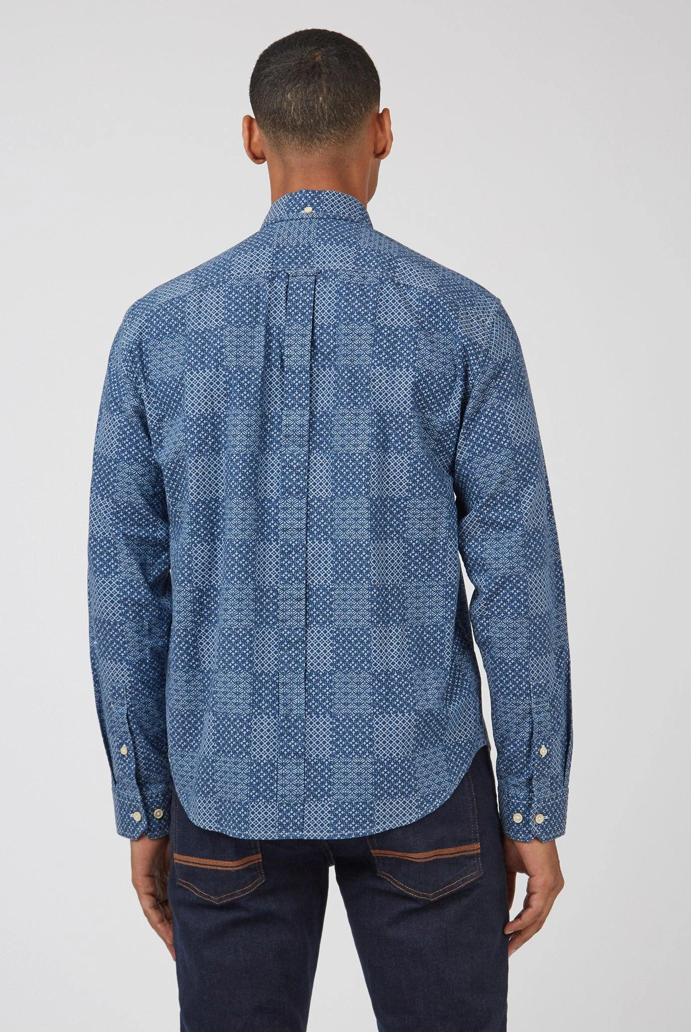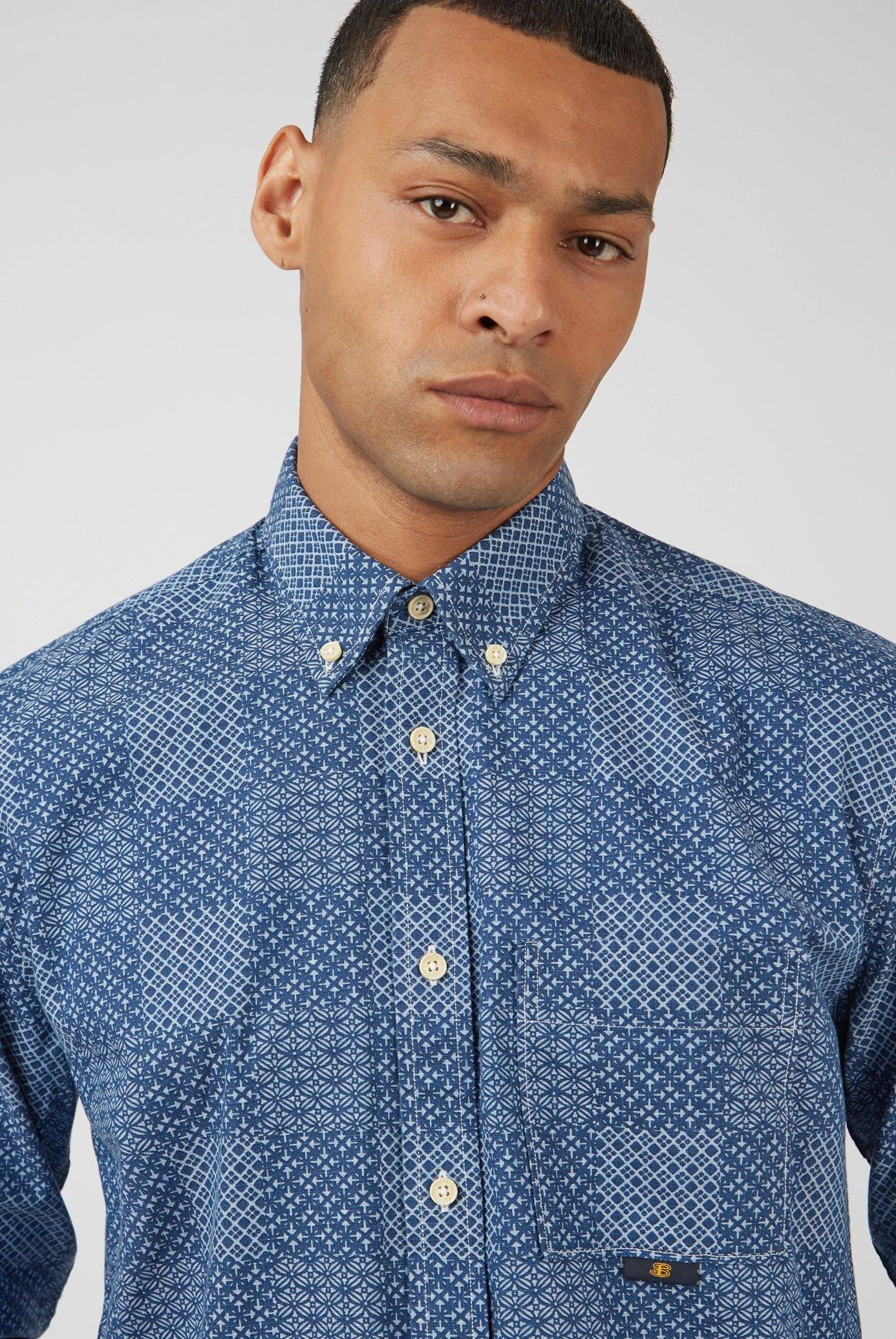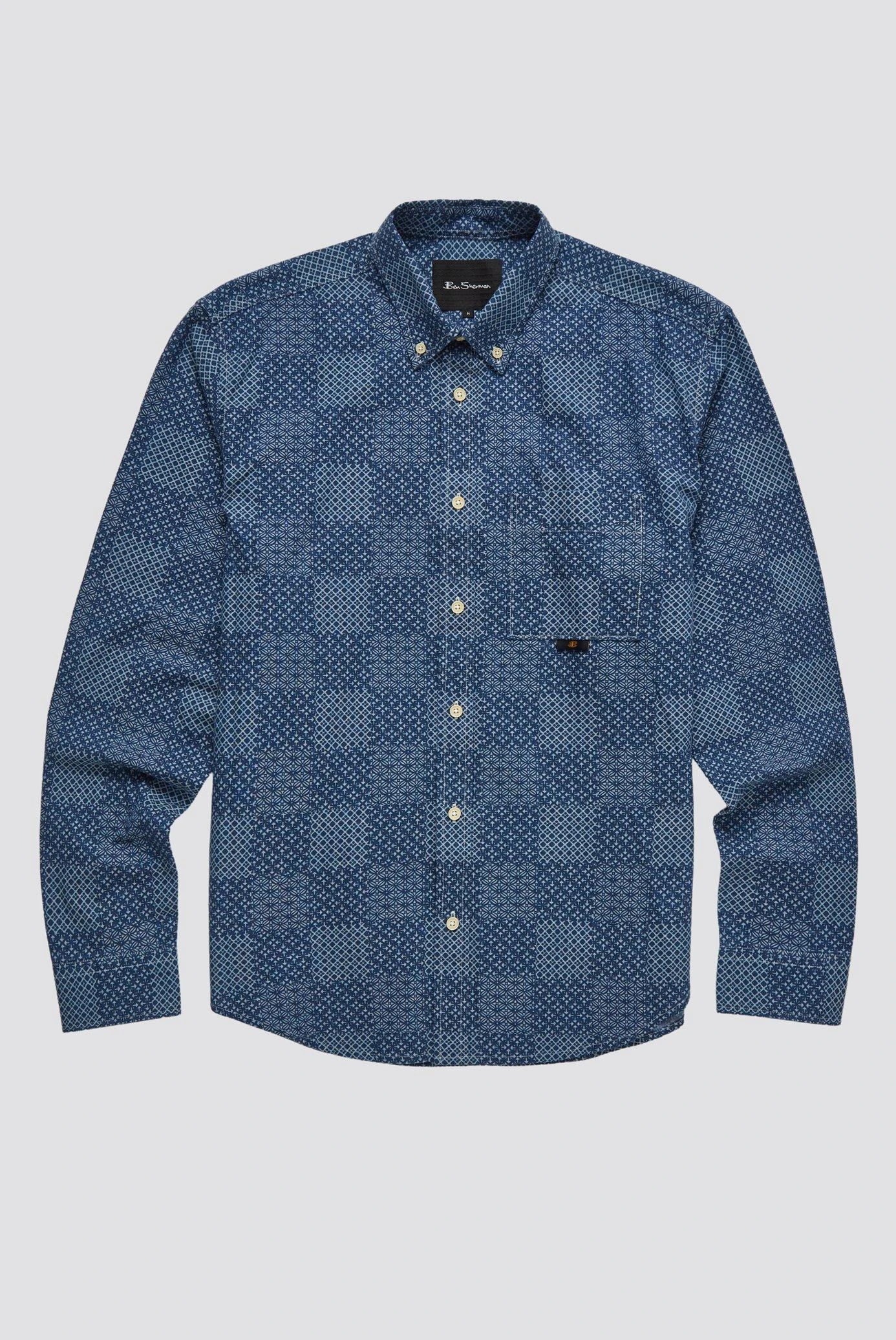 Chambray Patchwork Geo Print by Ben Sherman. This printed chambray patchwork geo print shirt comes in a relaxed fit and features a chest pocket and a 2 finger button-down collar.