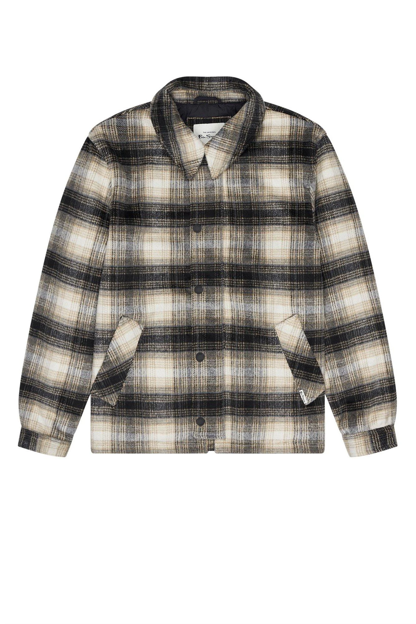 Check Coat by Ben Sherman. A coat in a check wool blend fabric. Features include wadded quilted lining, 2 deep external pockets with a ‘Ben Sherman’ branded flag label on the pocket seam, 1 internal pocket, and a placket that stops short at the hem.