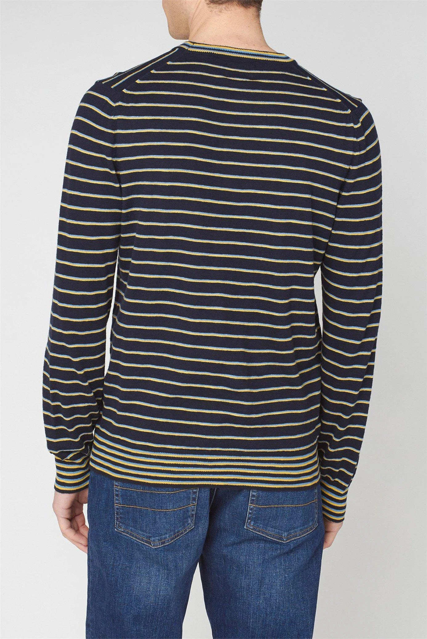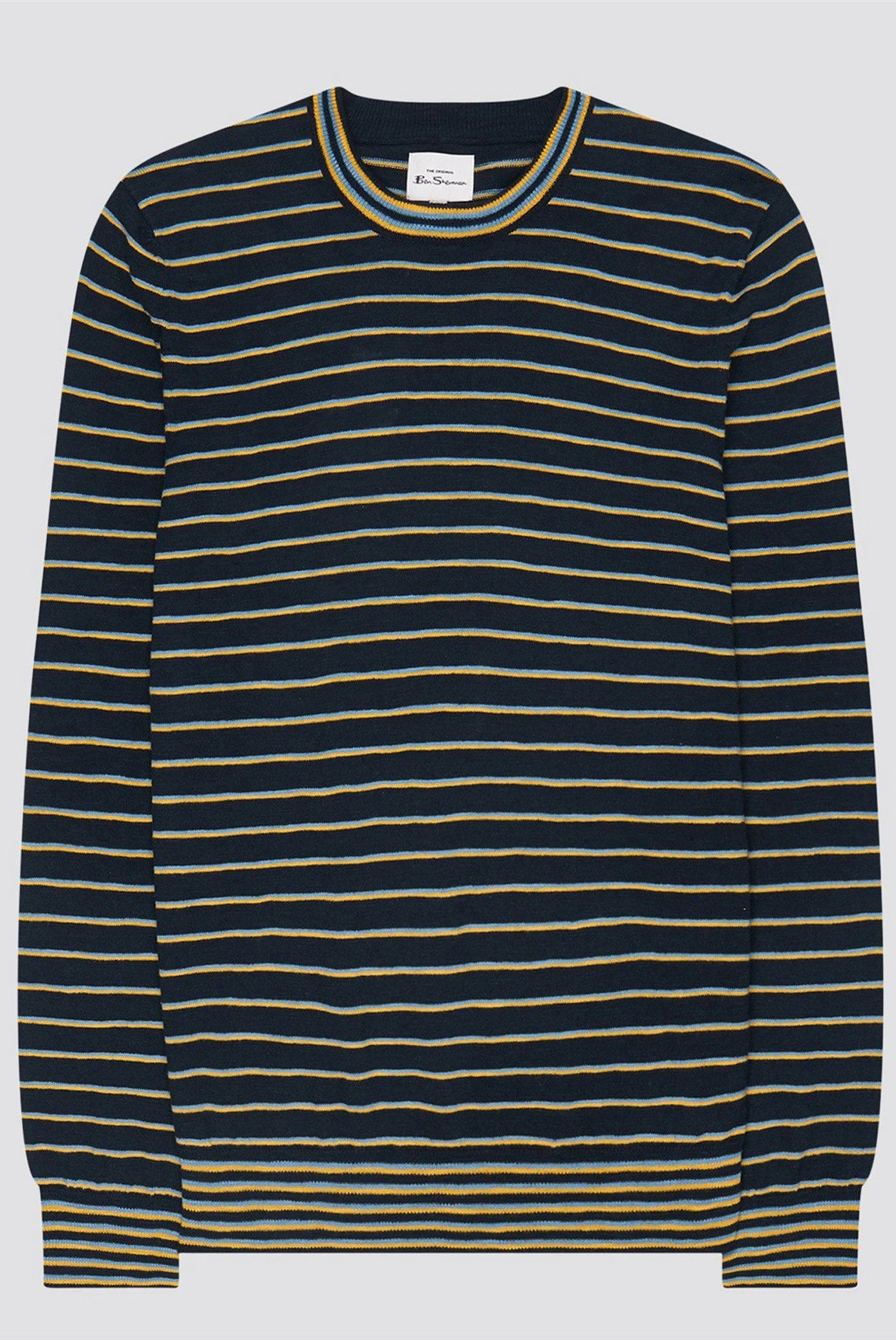 Cotton Slub Stripe Crew by Ben Sherman. 100% cotton crew neck in an all over stripe slub design. This jumper is designed with a 2 colour contrast stripe throughout and also features a striped rib at the collar, hem and cuffs. Branded with the Ben Sherman side tab.