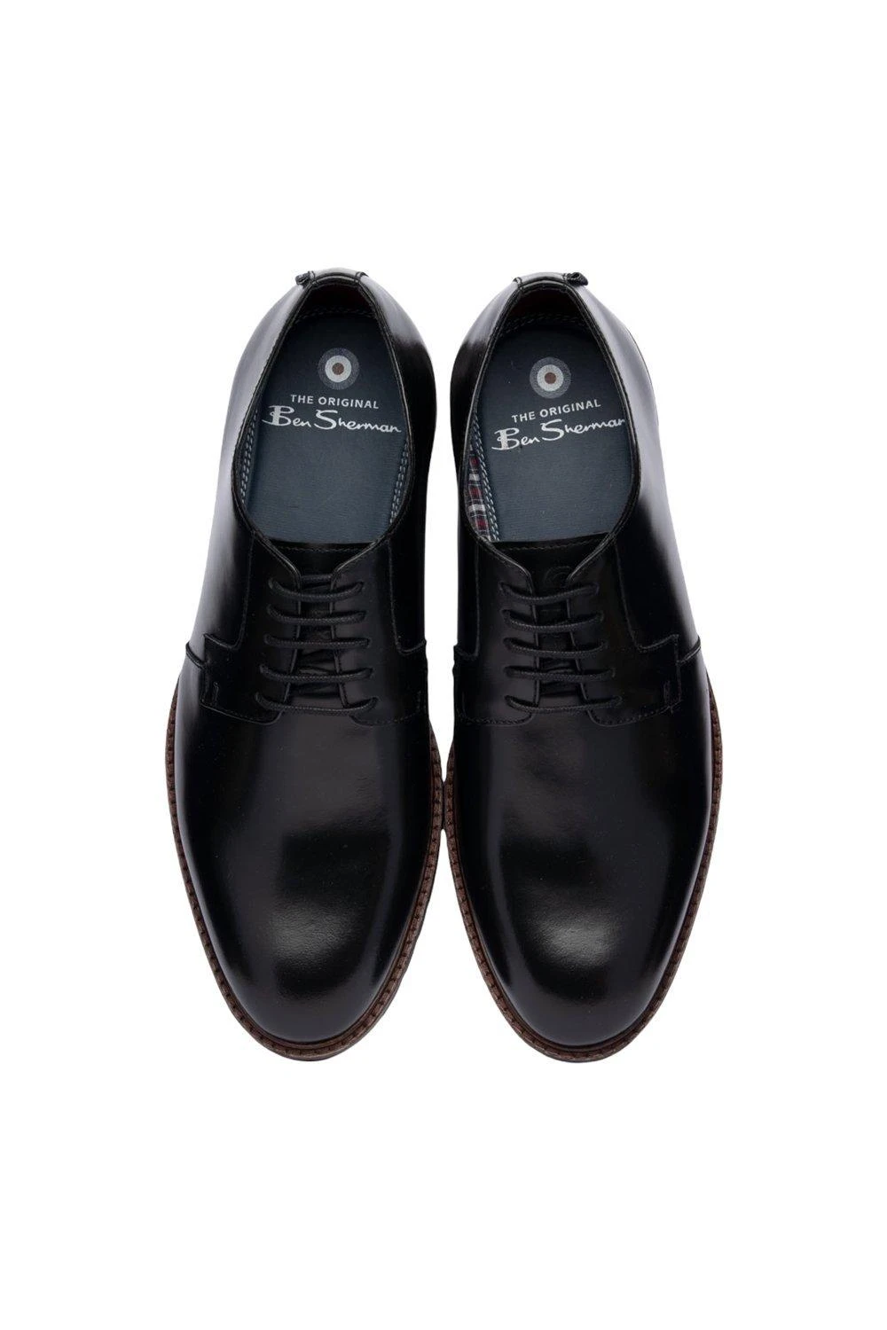 The Fleet from Ben Sherman. A smart black high shine leather derby, finished on a chunky cleated rubber sole. Fleet features signature house check lining, a padded insock and is finished on a smart rubber sole.