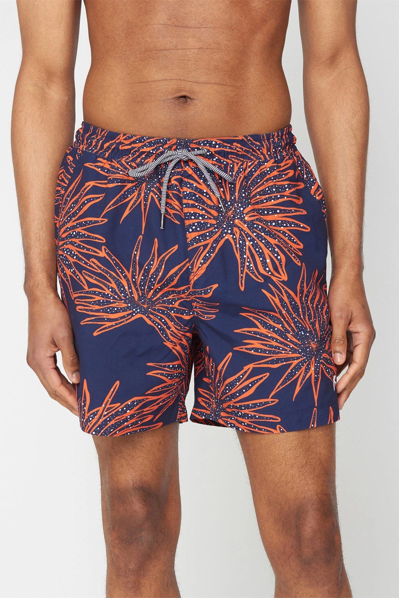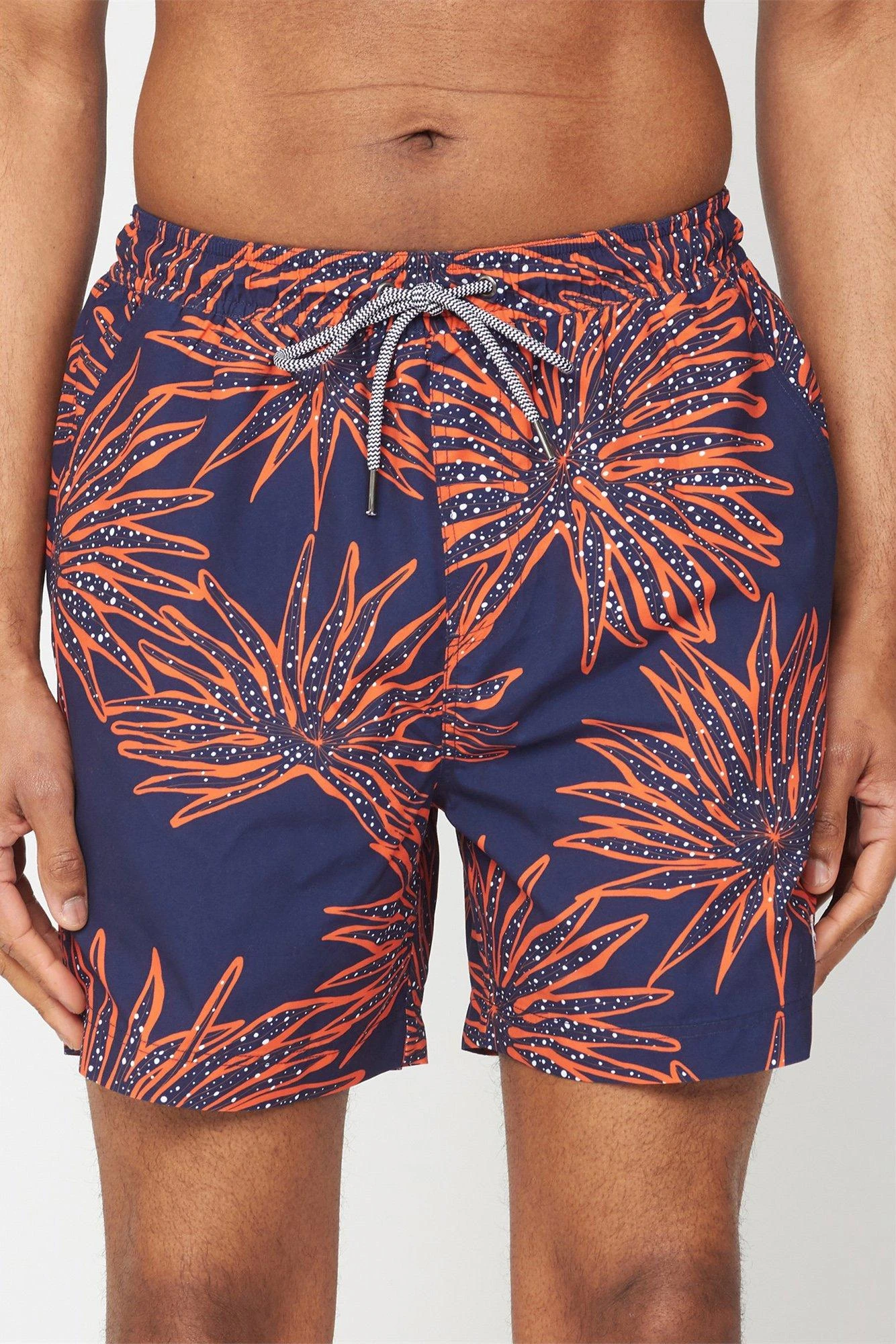 Burst Print Swimshort by Racing Green. Racing Green Orange Burst Print Swim short. Refresh your summer style with these vibrant swimshorts in a striking navy and coral prnt. With elasticated waist and drawcord for comfort and ease of fit, mesh lining, side pockets and a subtle embroidered logo- a holiday essential from a contemporary British lifestyle brand.