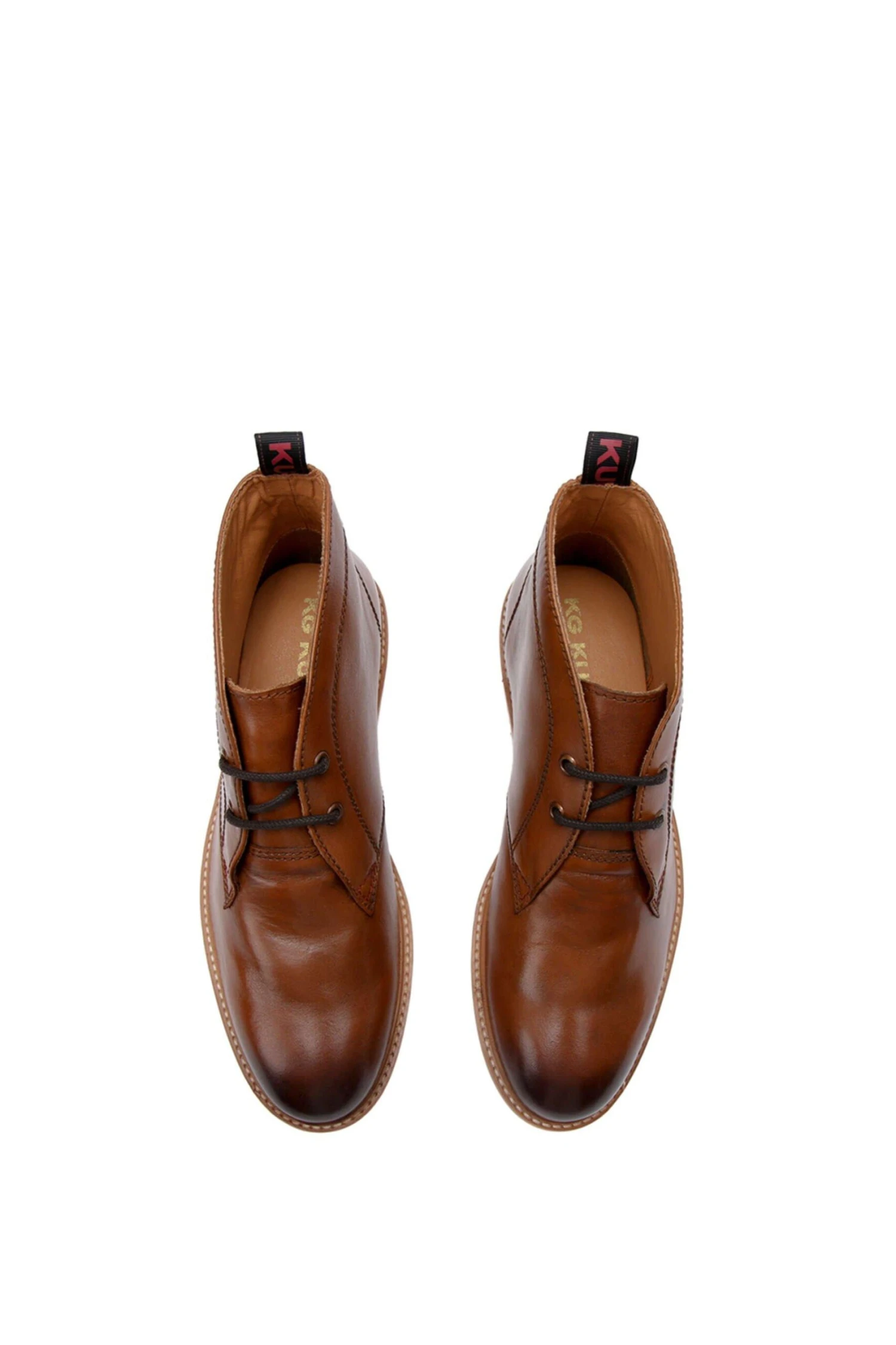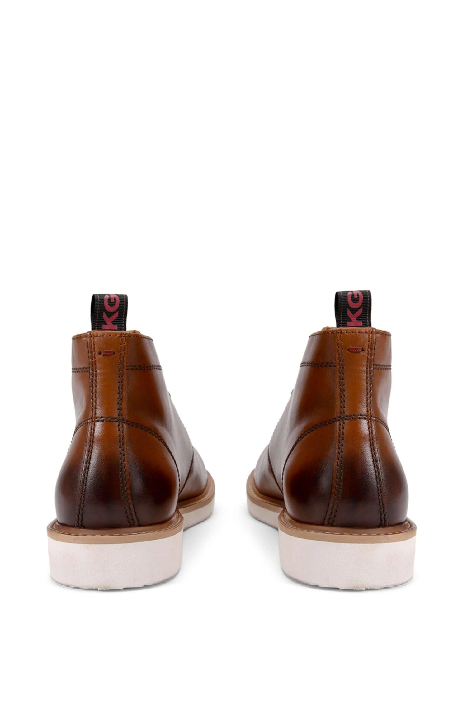 The Dennis boot features a tan upper in shiny leather. The back of the ankle features a KG Kurt Geiger logo printed on ribbed textile with a print stitch detailing tab. Material: Leather. Style number: 9325533109.