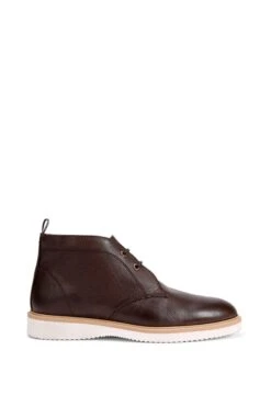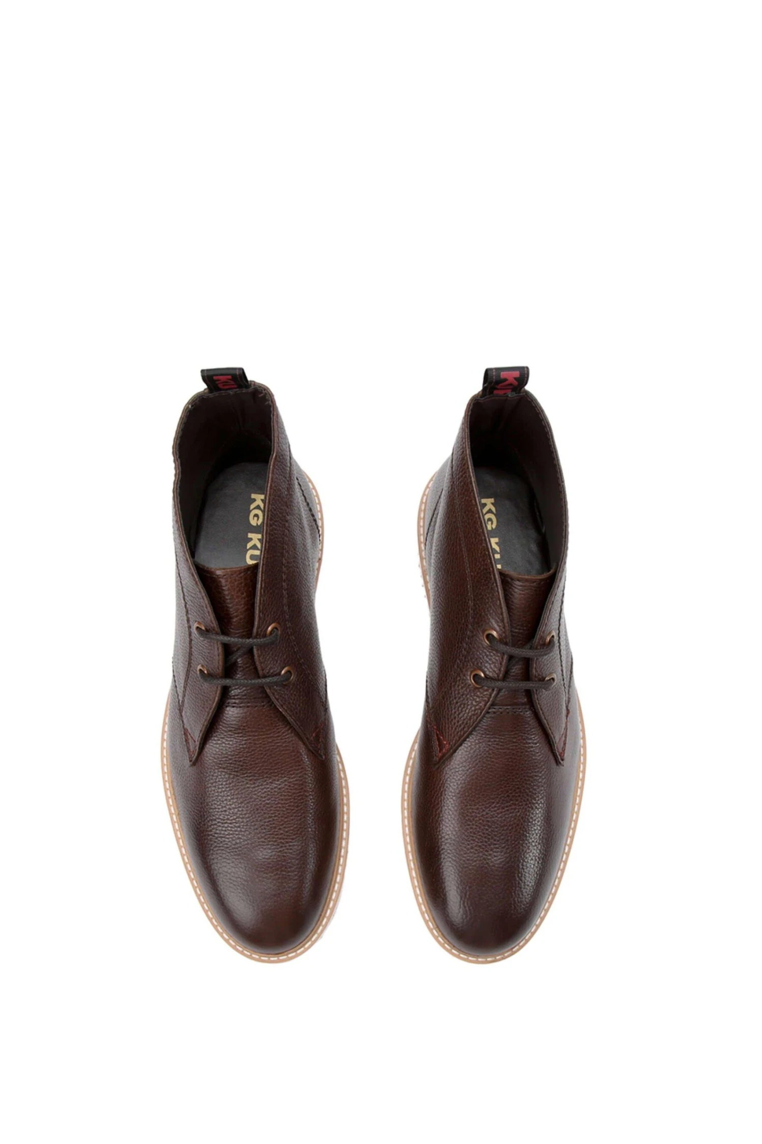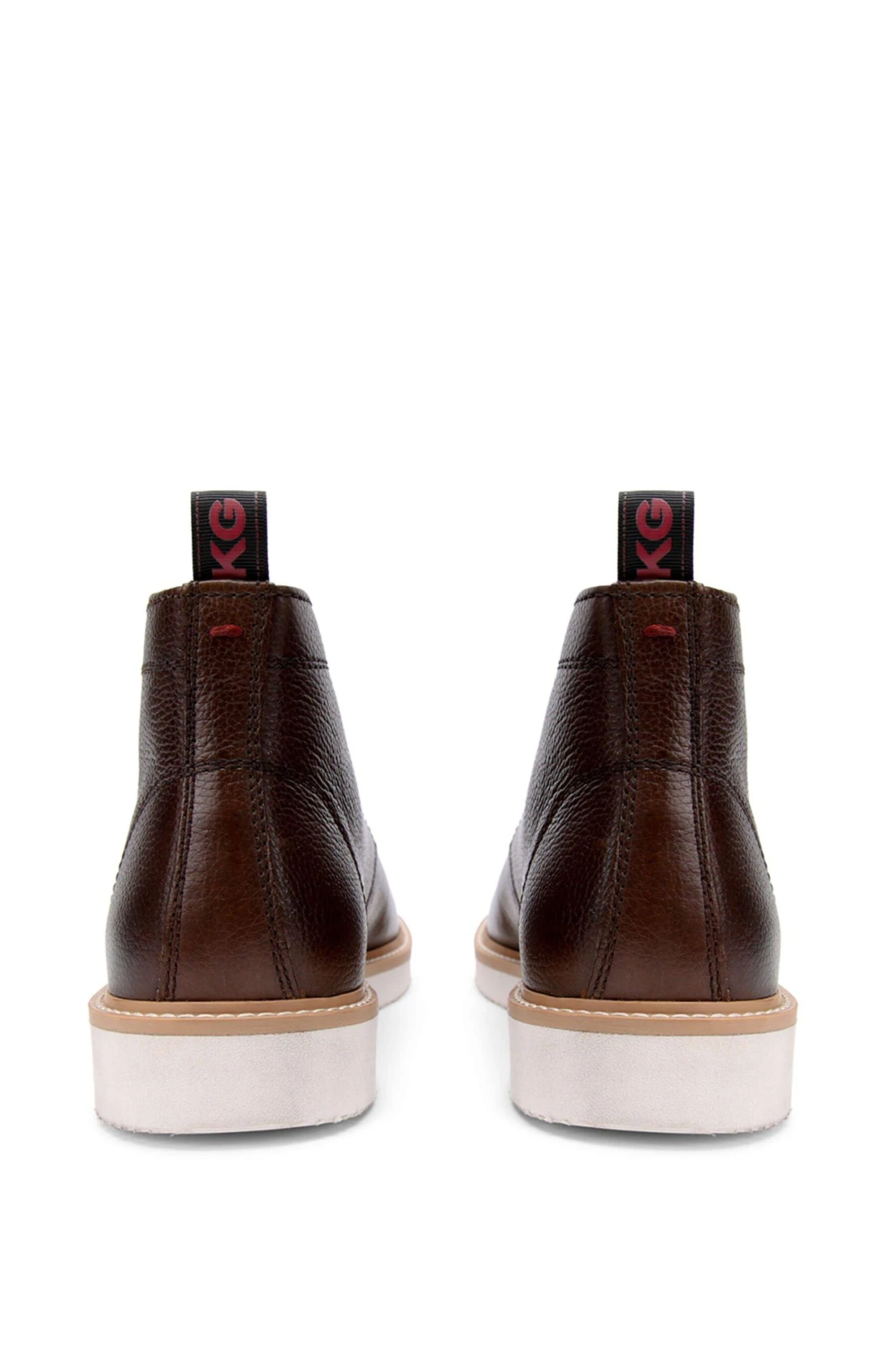 The Dennis boot features a brown with slight texture to the leather. The back of the ankle features a KG Kurt Geiger logo printed on ribbed textile with a print stitch detailing tab. Material: Leather. Style number: 9325530109.