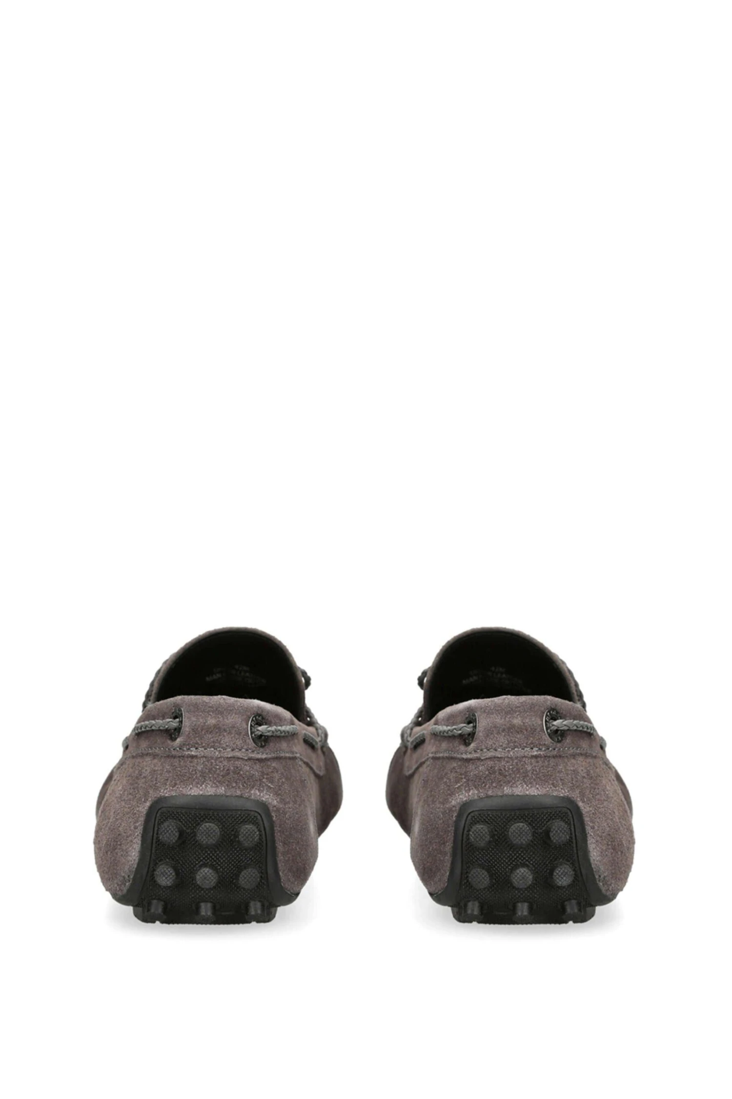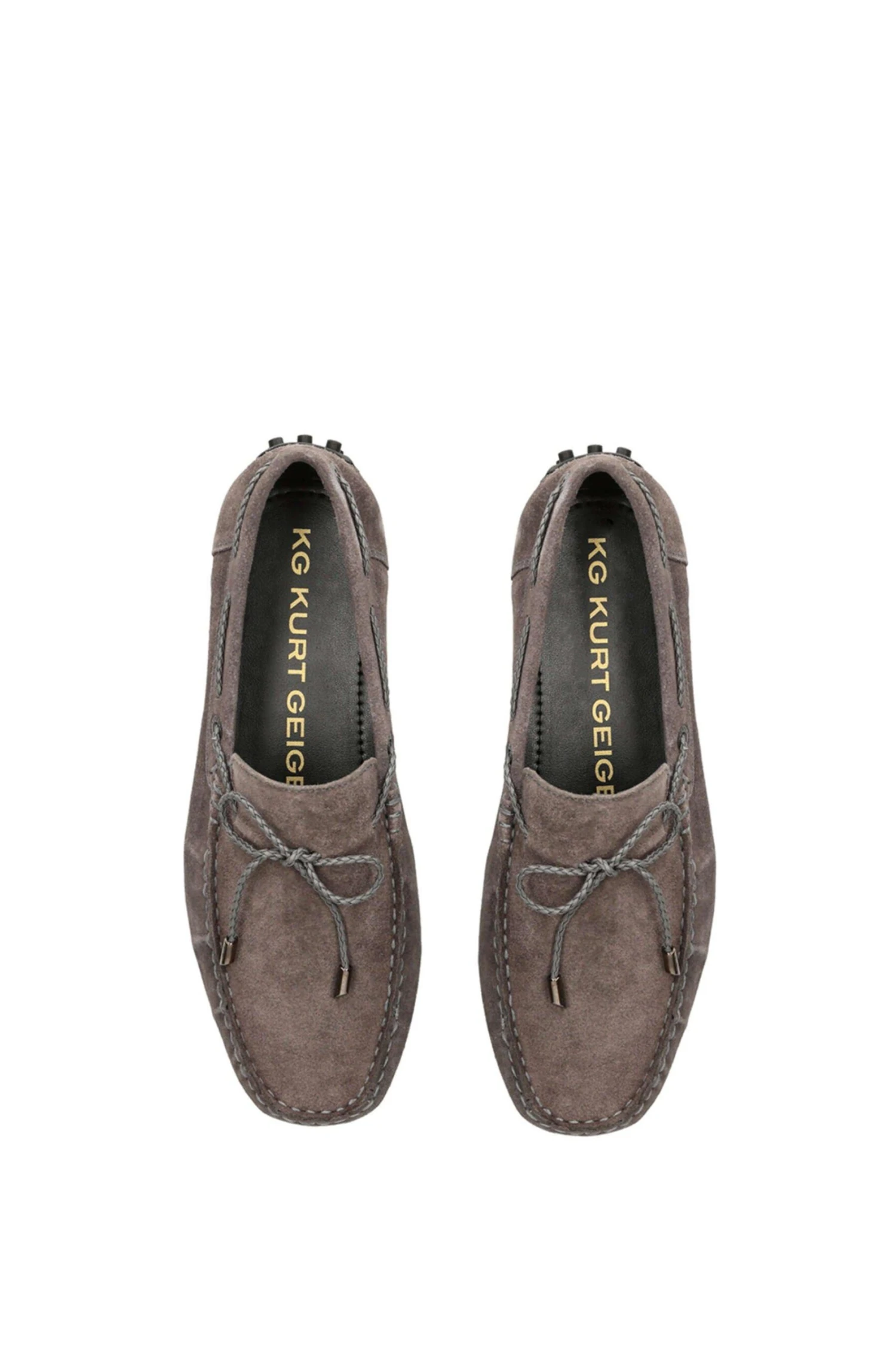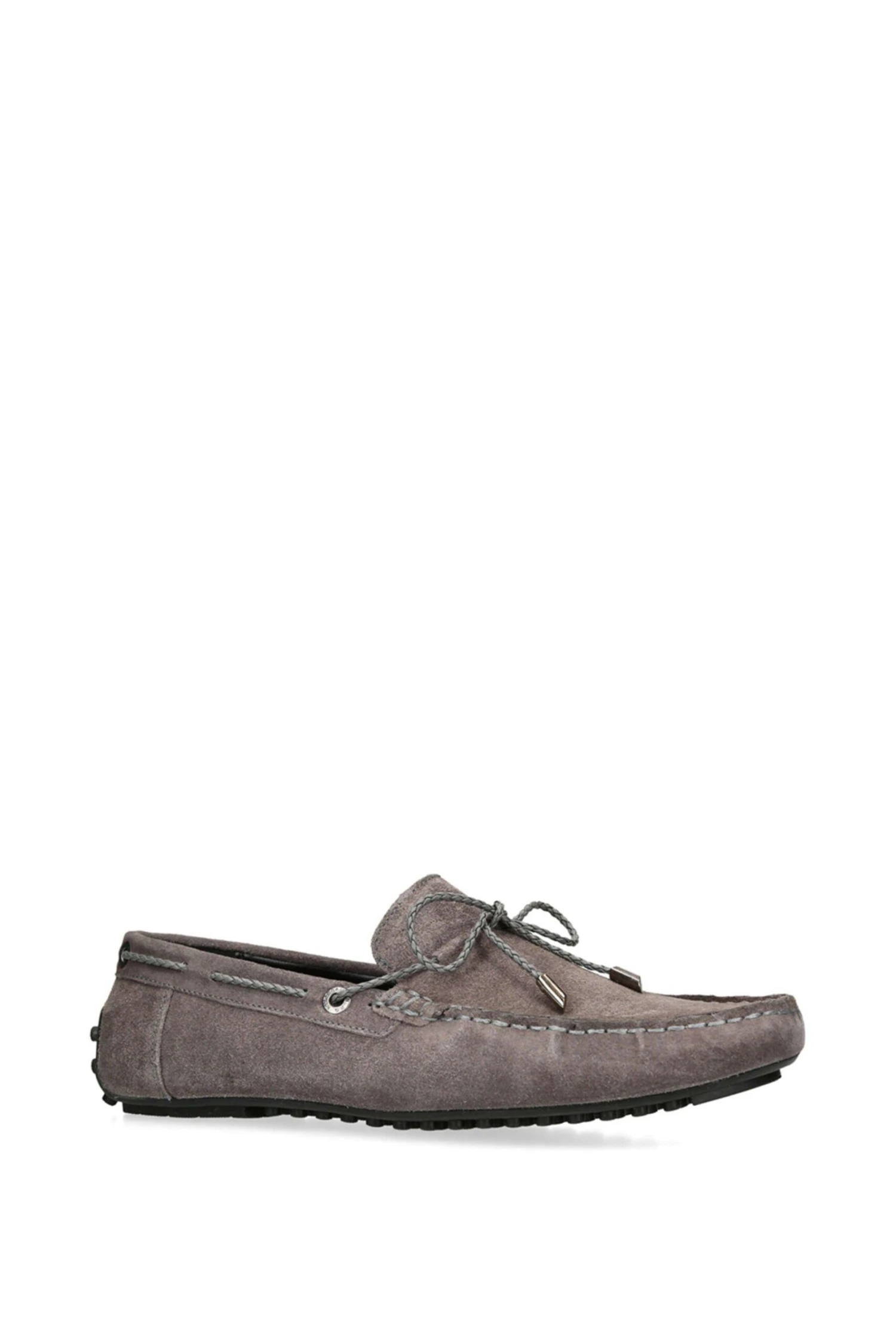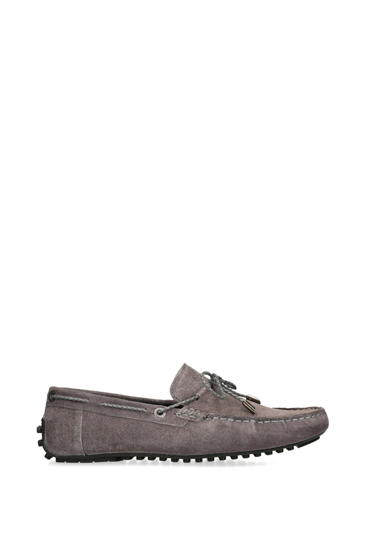 The Felix is a slip on loafer crafted in a grey suede. There is a grey braided strap pulling through the upper which creates a bow at the vamp.