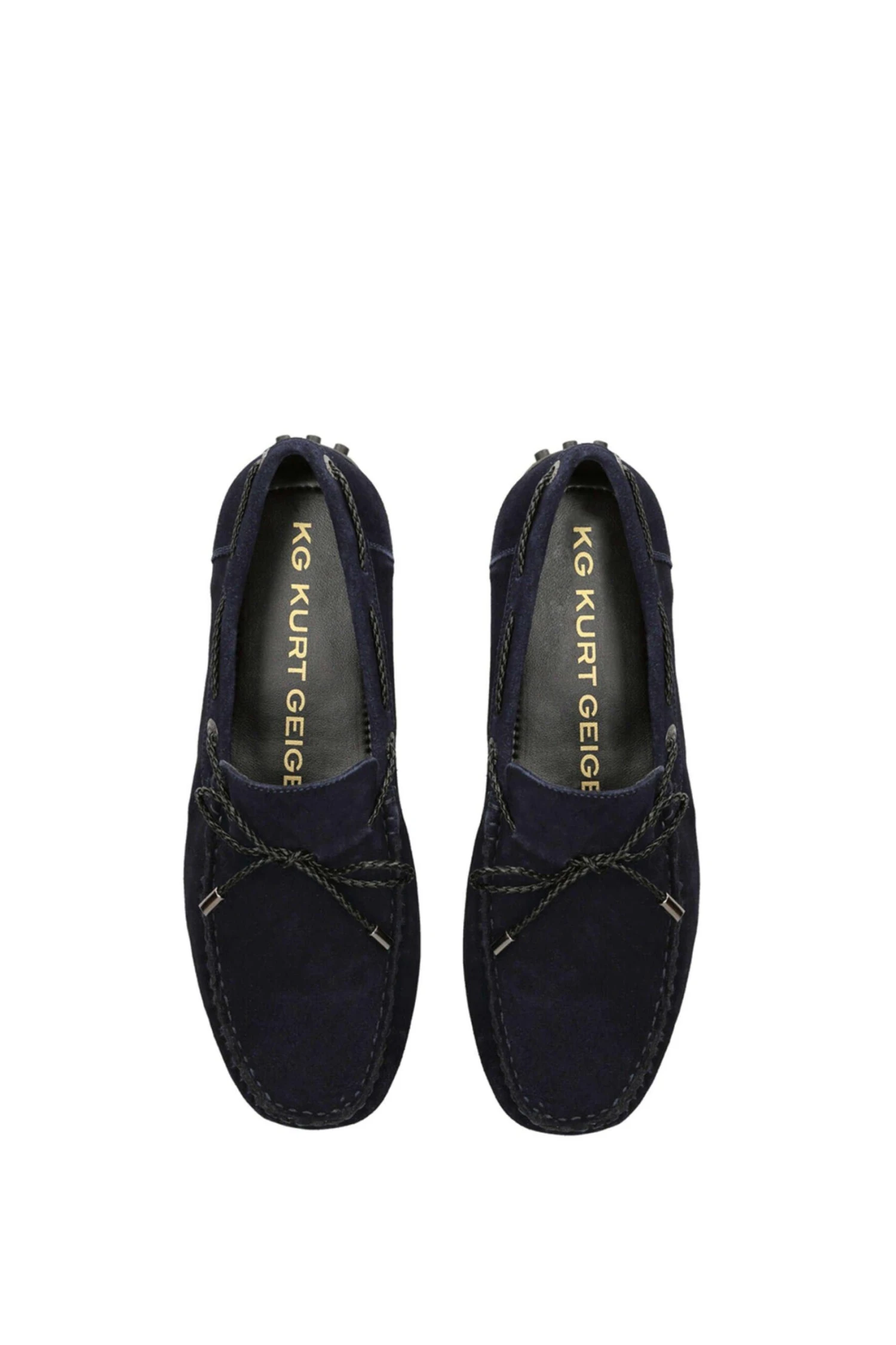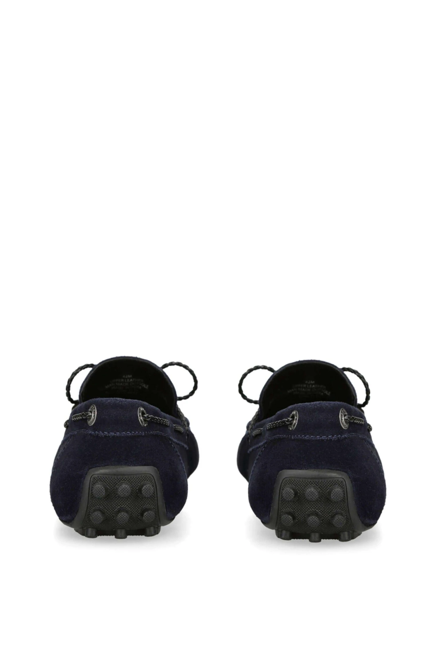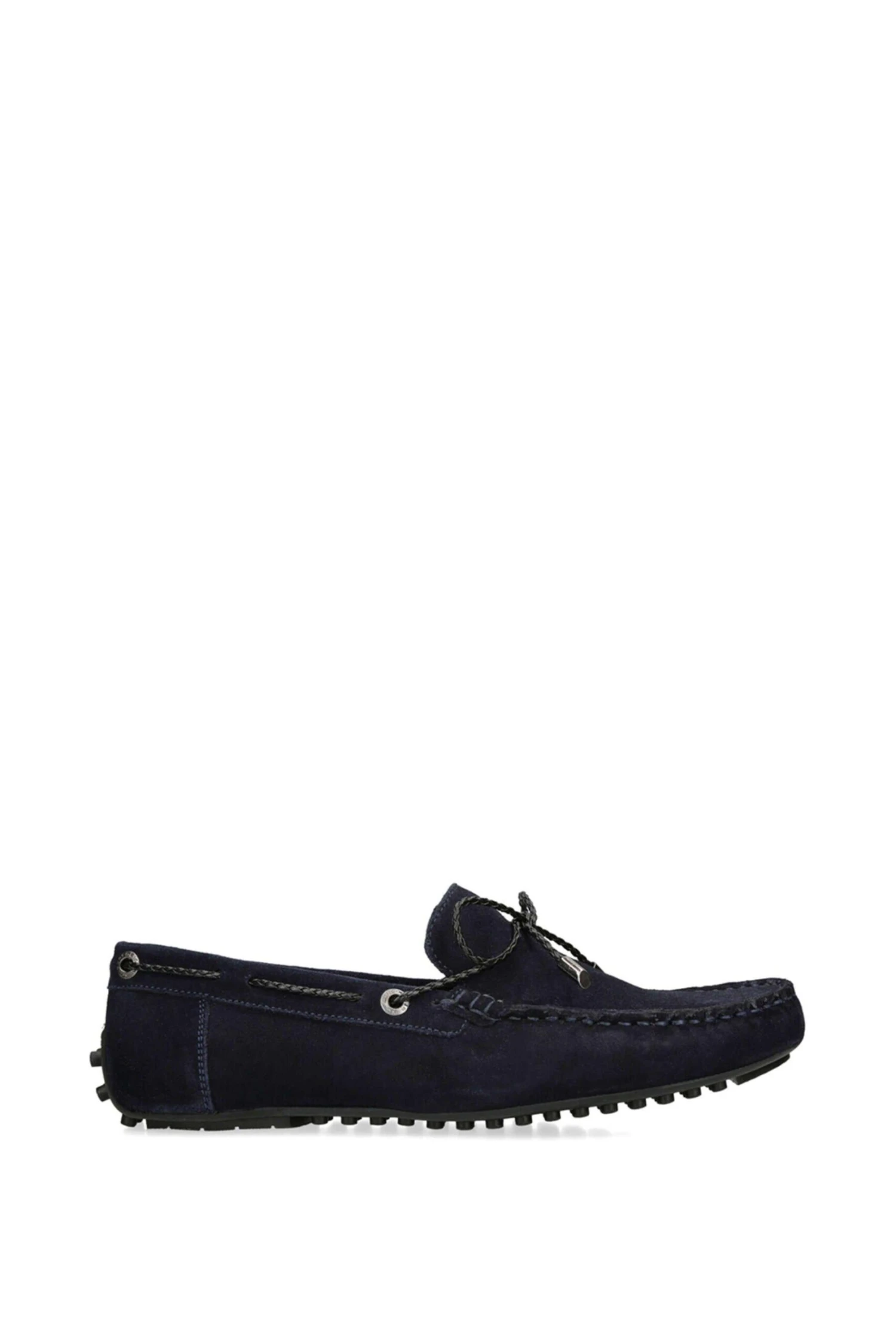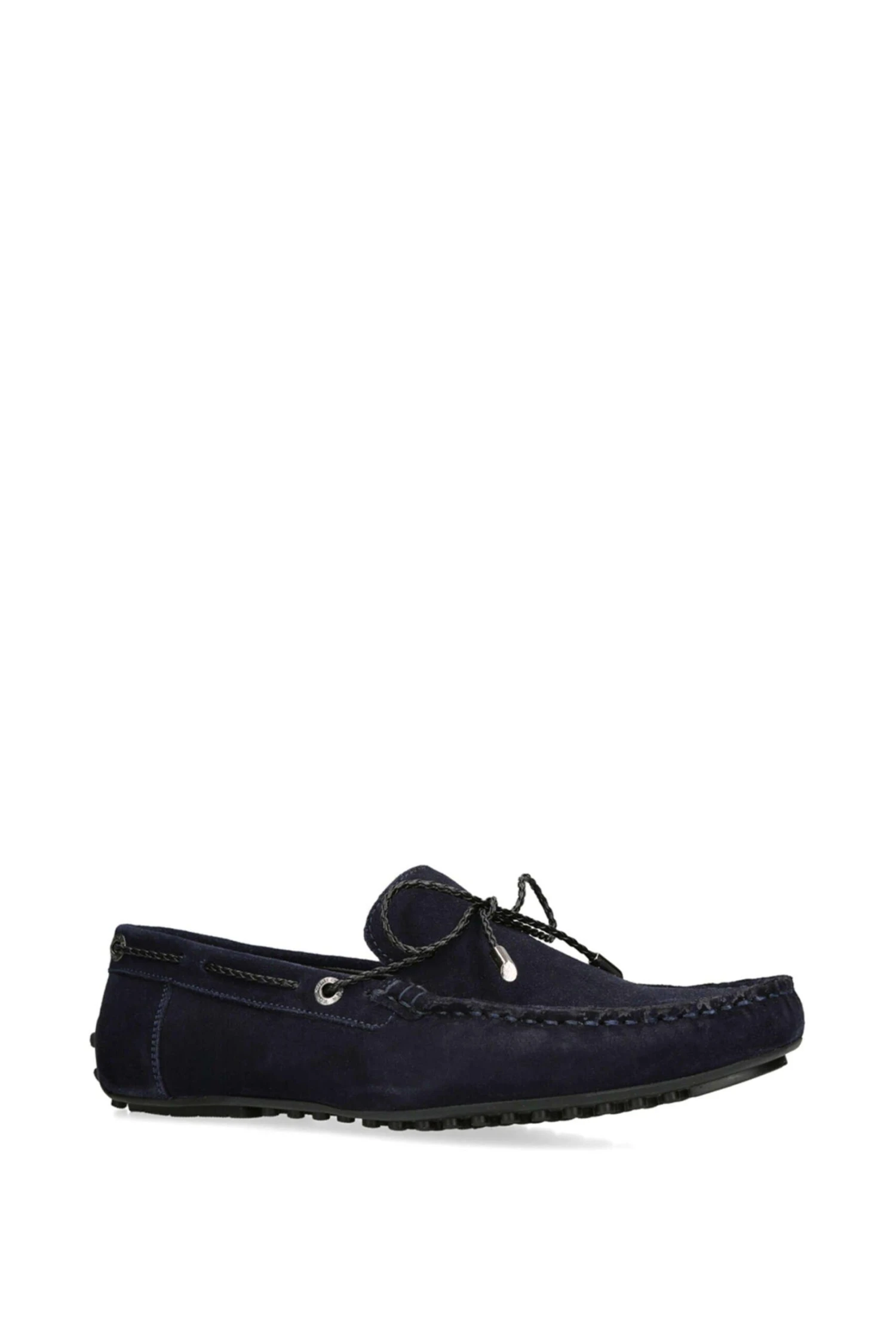 The Felix is a slip on loafer crafted in a navy suede. There is a black braided strap pulling through the upper which creates a bow at the vamp.