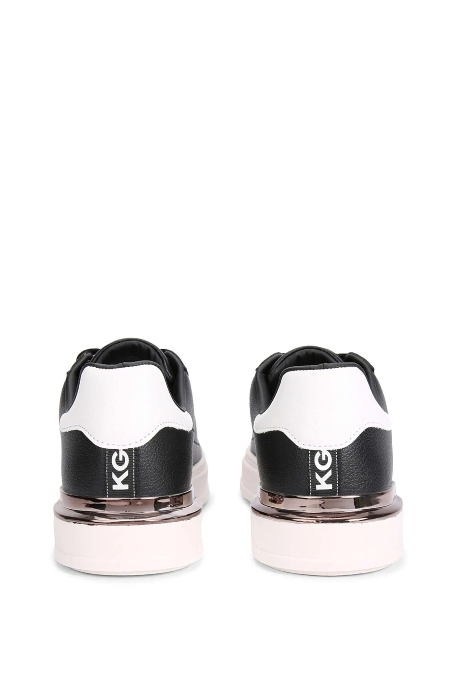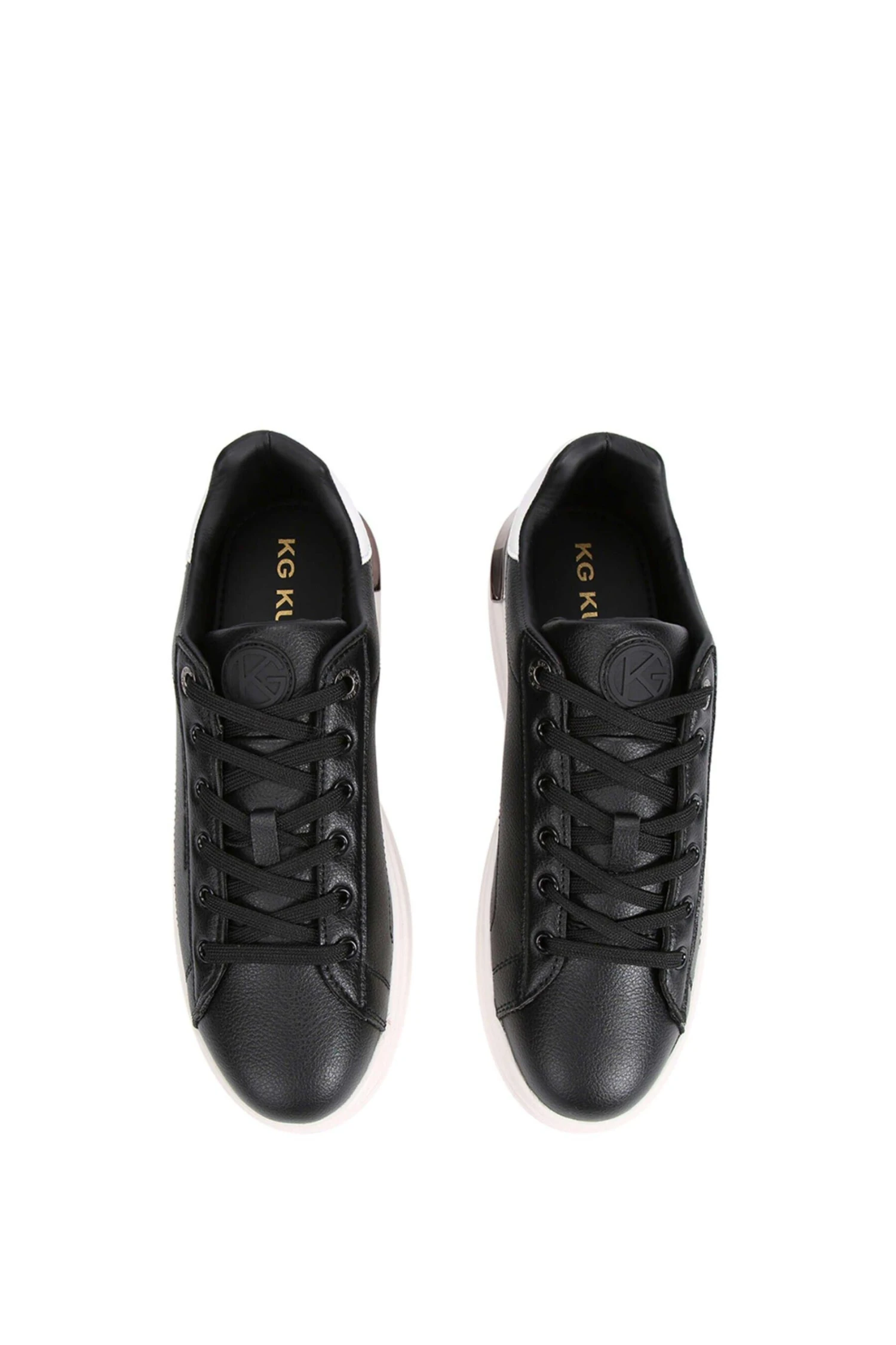 Keaton by KG Kurt Geiger is a low top, lace up trainer with a black upper and a white sole with a metallic panel at the heel.