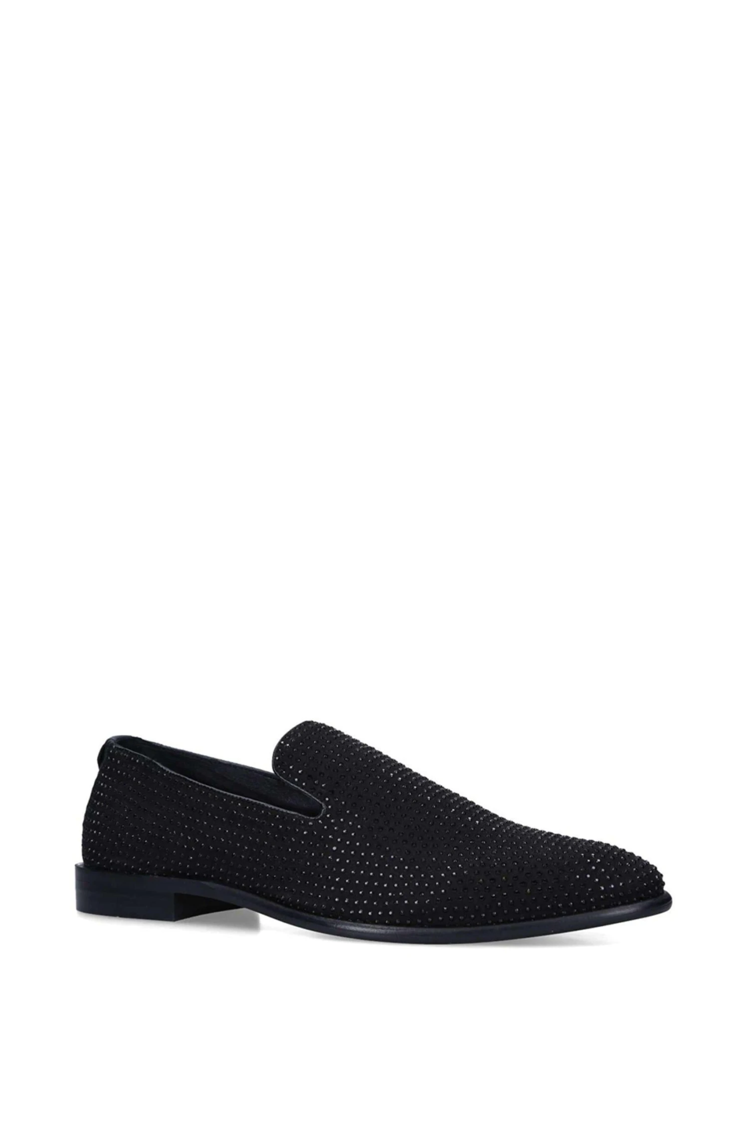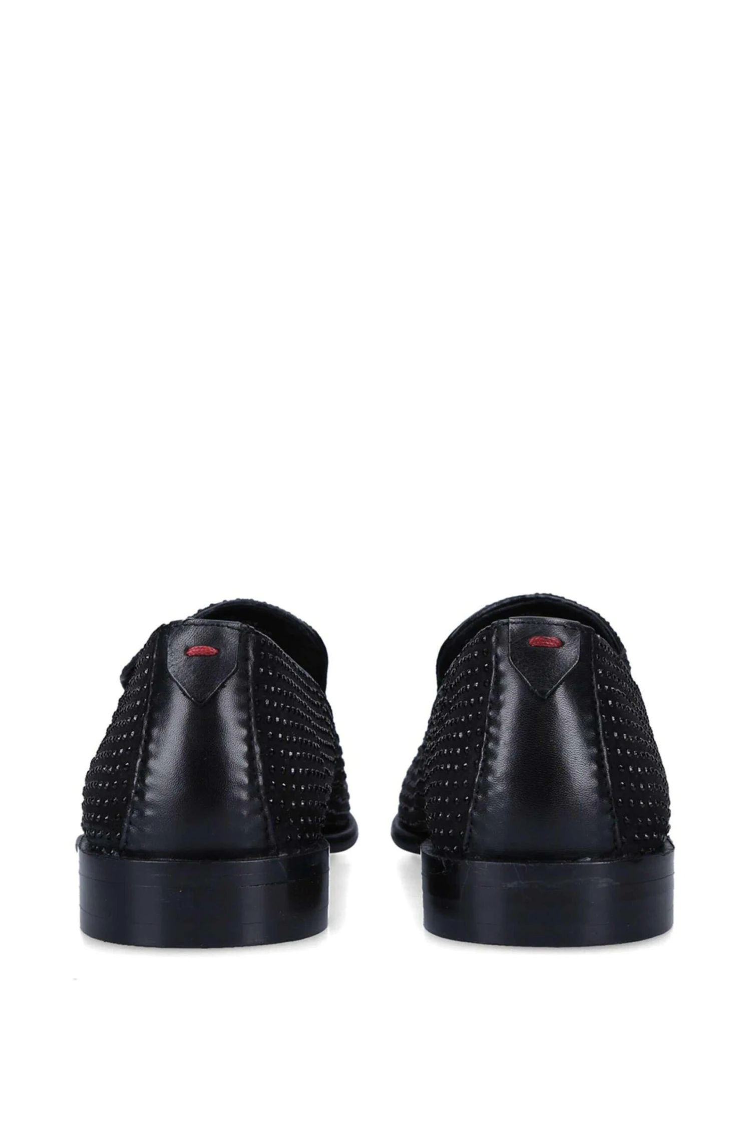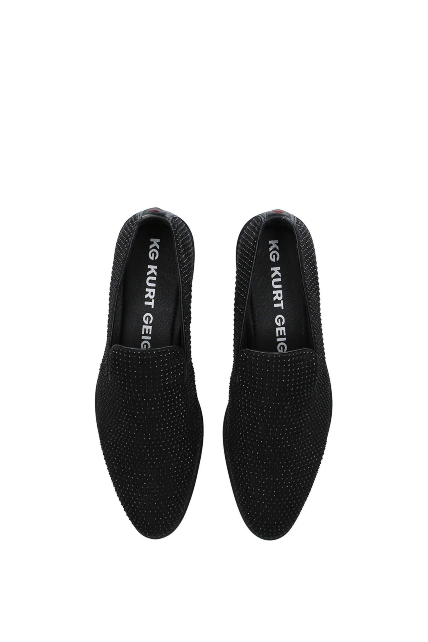 Crafted in a black suedette material, the Sting loafers are a formal style embellished with small black studs across the upper. The ankle features a very small red stitch sitting comfortably on a black block heel.