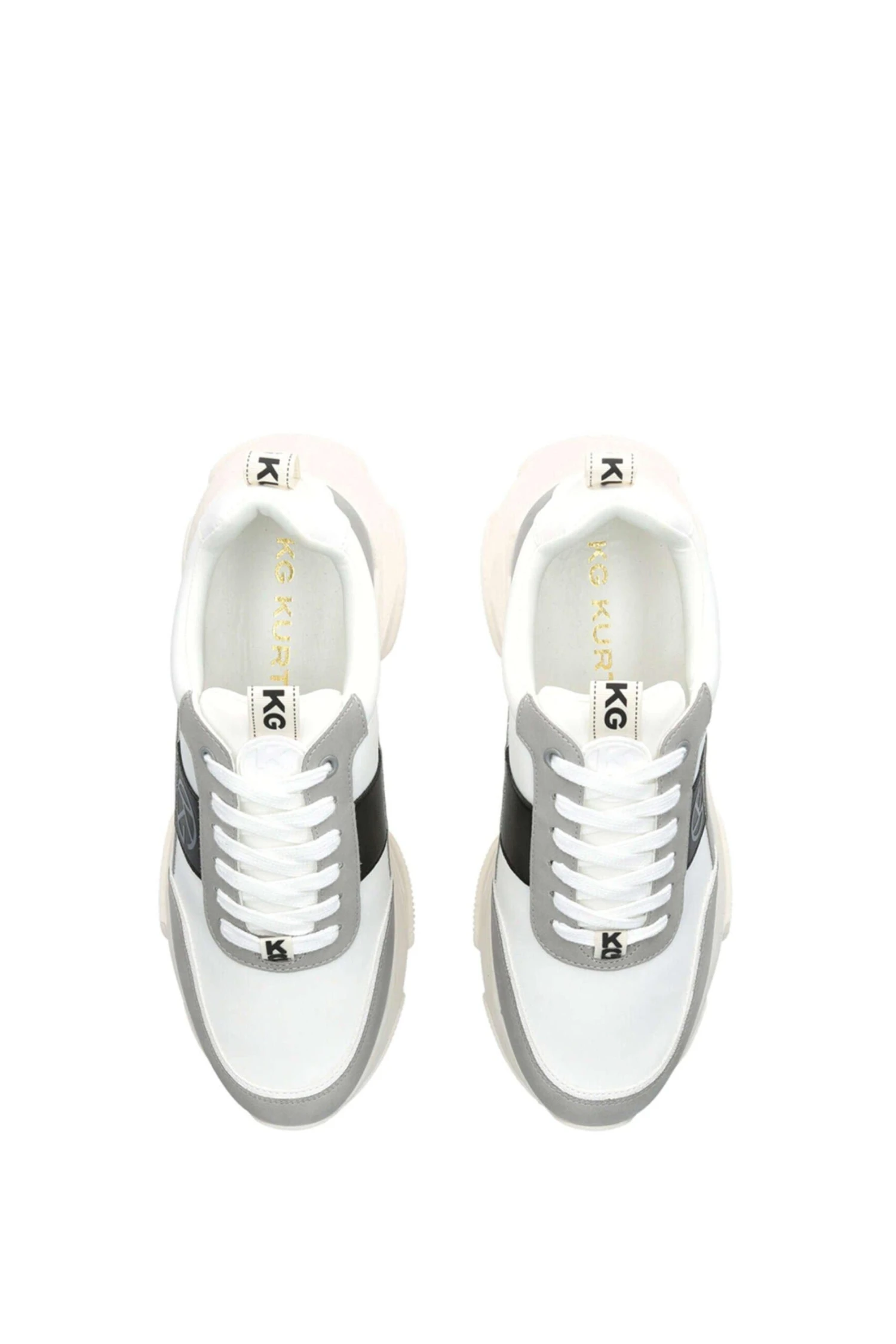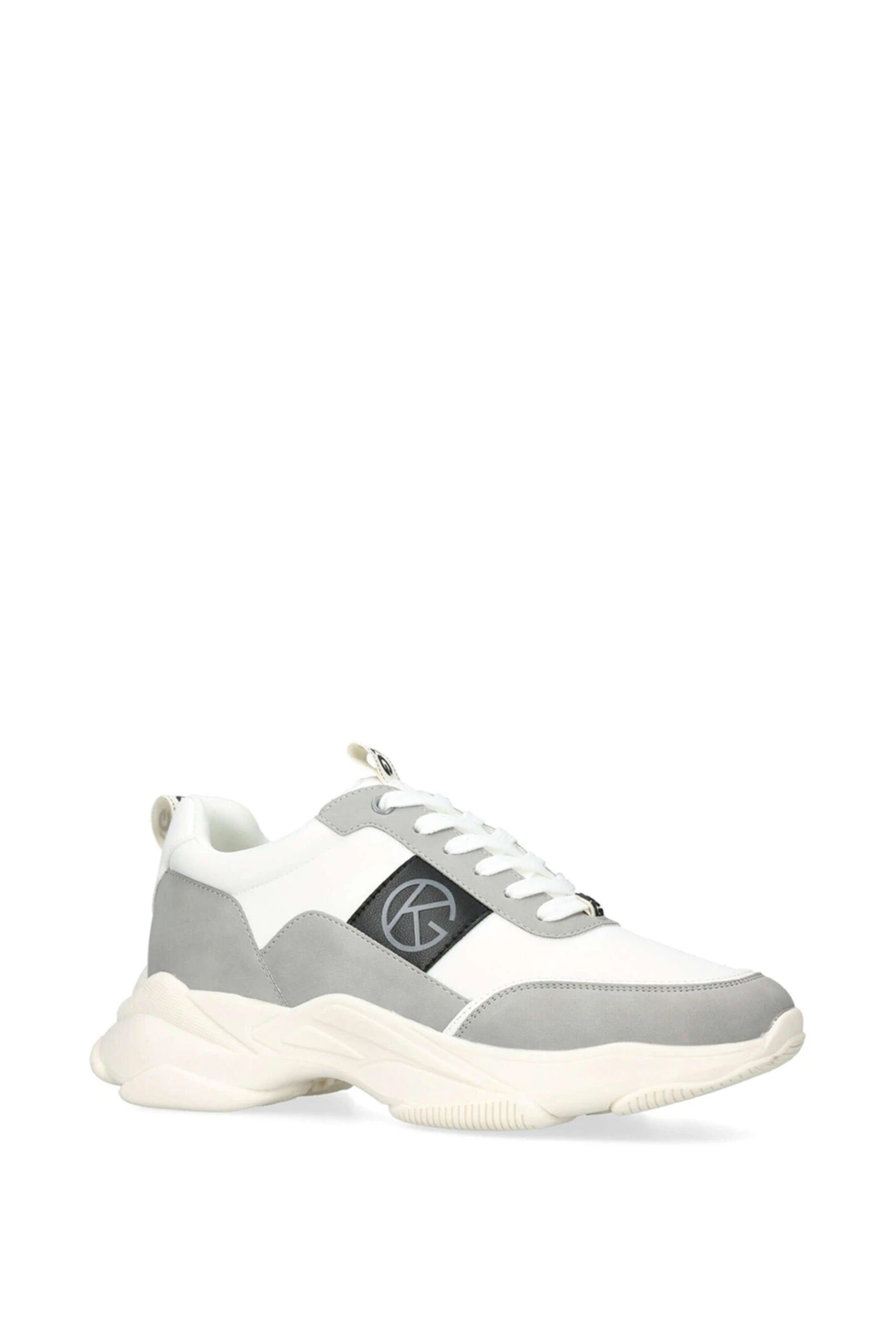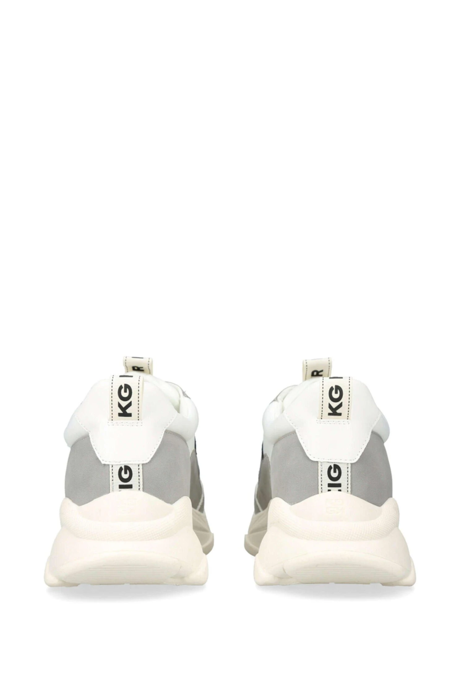 The beige Wolf sneaker features a grey and white upper. There are two KG Kurt Geiger logo printed on ribbed textile with a print stitch detailing tabs at the ankle as well as a white rubber monocle with the KG Kurt Geiger logo on the tongue.