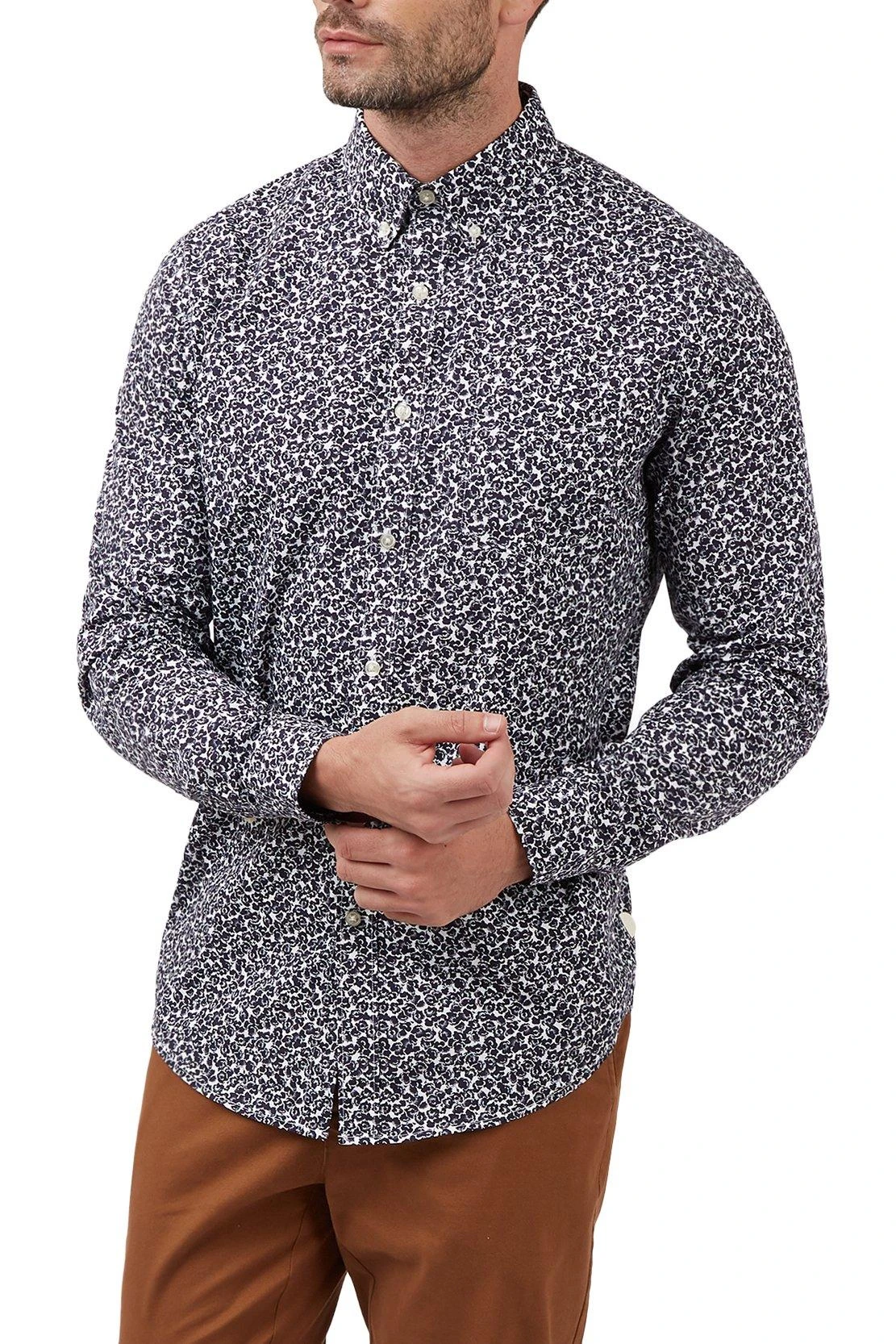 100% cotton with soft water-based print. Button-down collar. Open back box pleat for ease of movement. Front chest pocket. Leatherette branding tab with stamped logo. Oxford trim inside the back yoke. Model wears a size M.