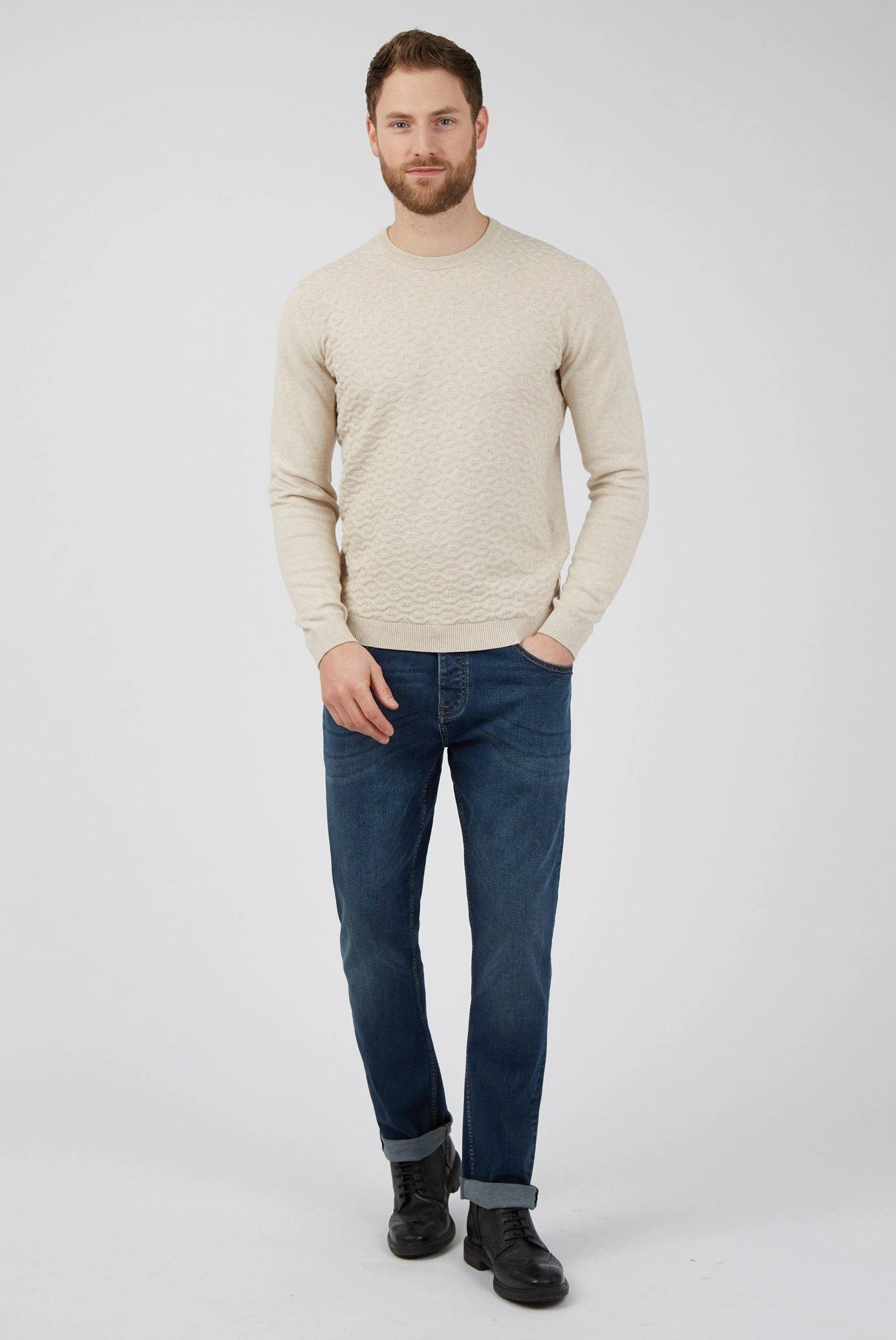 Raised Geo Knit Crew by Racing Green. Since our creation in 1990, Racing Green menswear has been woven into the everyday. The Stewart Crew neck has been 30 years in the making, over the years we have tweaked and tinkered to create the perfect fit that works for all occasions. Designed from heritage knit structure infulences, the front panel features a raised geo knit pattern. It is finished with a deep ribbed neck, cuffs and hem create a clean, contemporary style. Our inspiration is rooted in people that make up everyday British life; influencing the careful consideration of materials, colours and archival trends that define our collections for you. We aim to deliver quality-led and original product, that is an ode to a day in the life on our unique and eccentric isles.