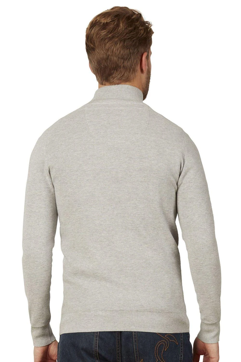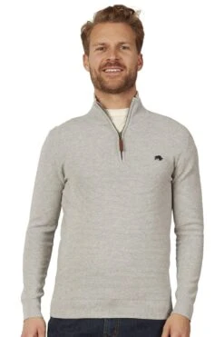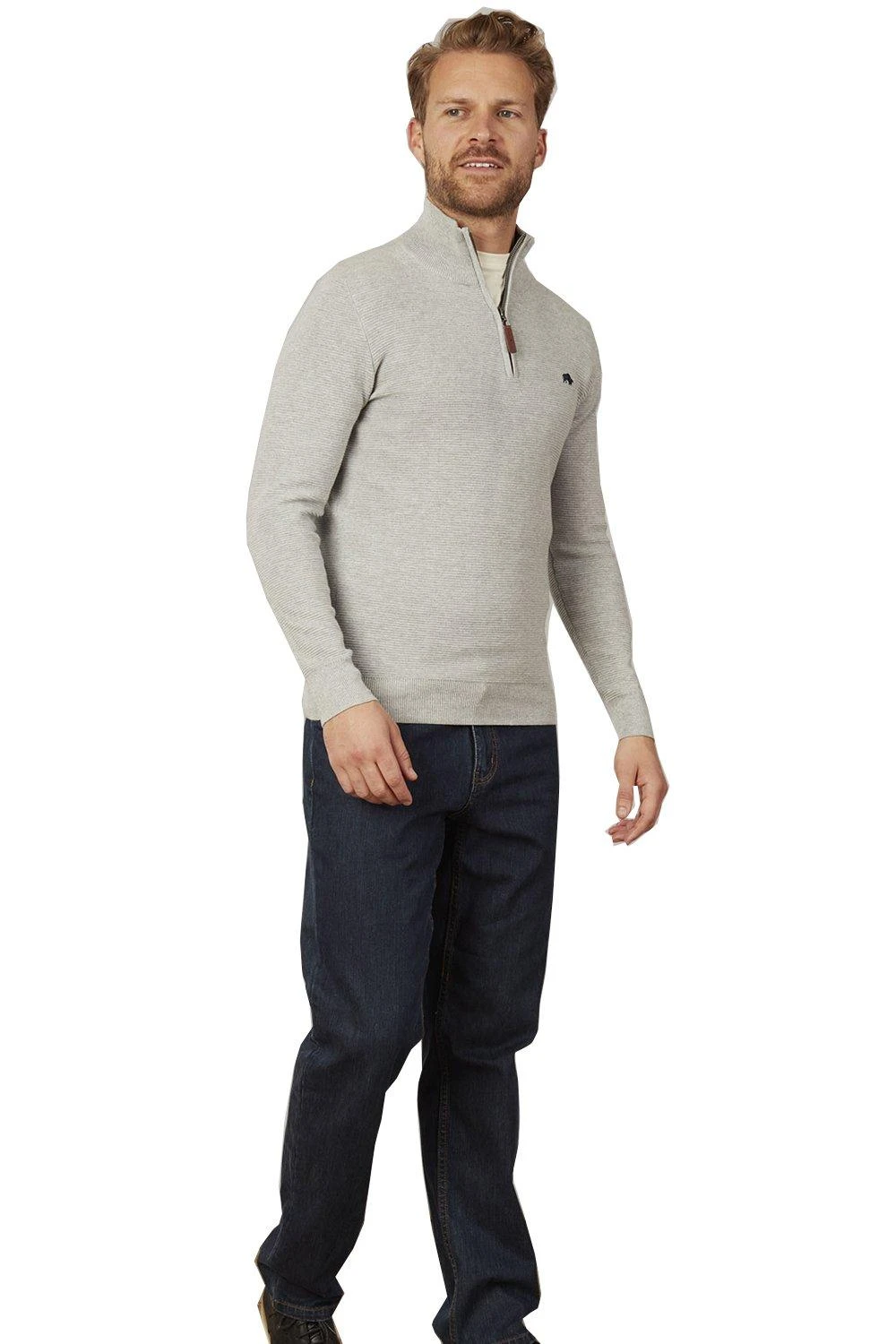 Our classic quarter zip knit is perfect for those cool summer evenings. It has a soft touch ribbing detail all over with a striped print inside the collar and features the Iconic Bull logo to left han