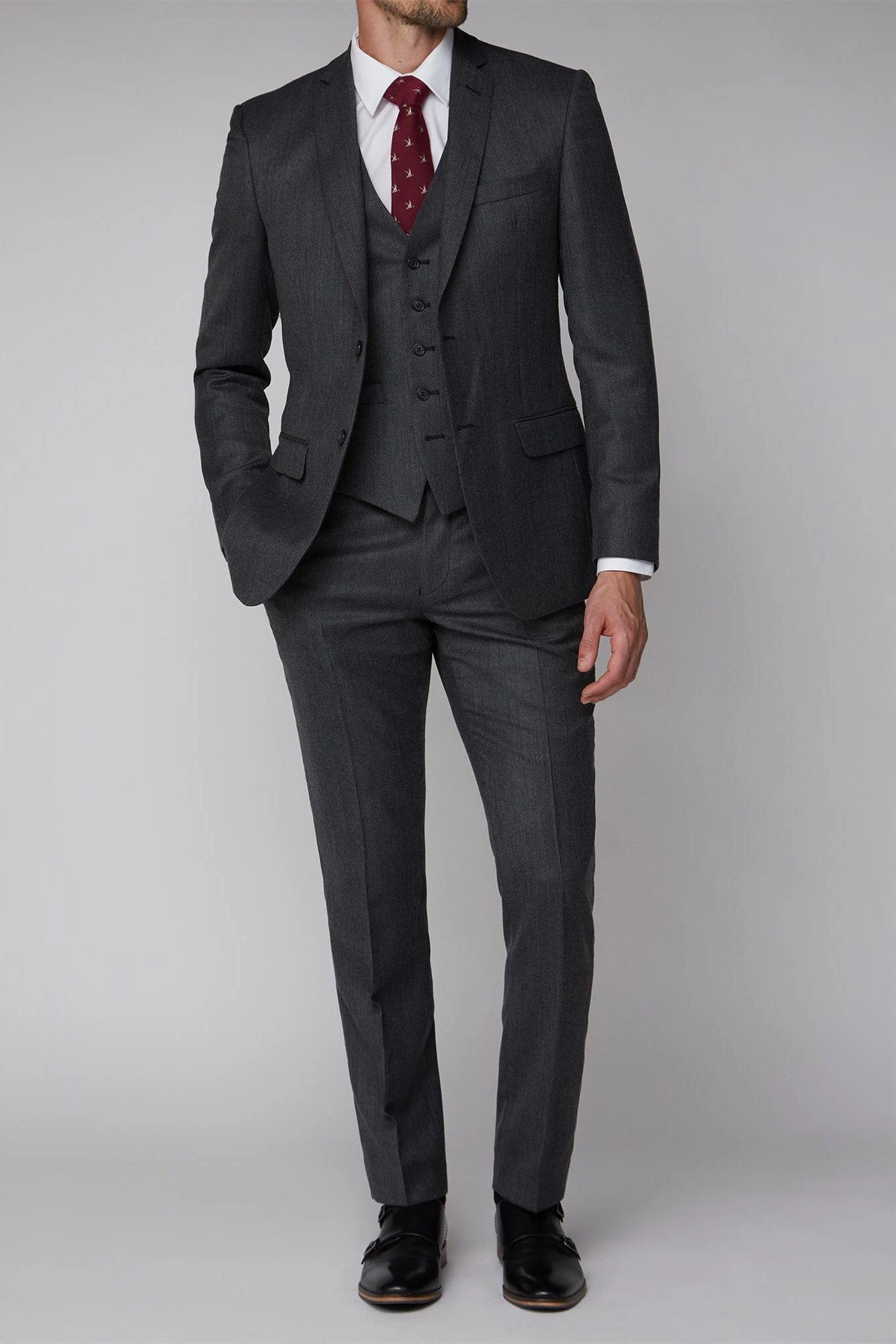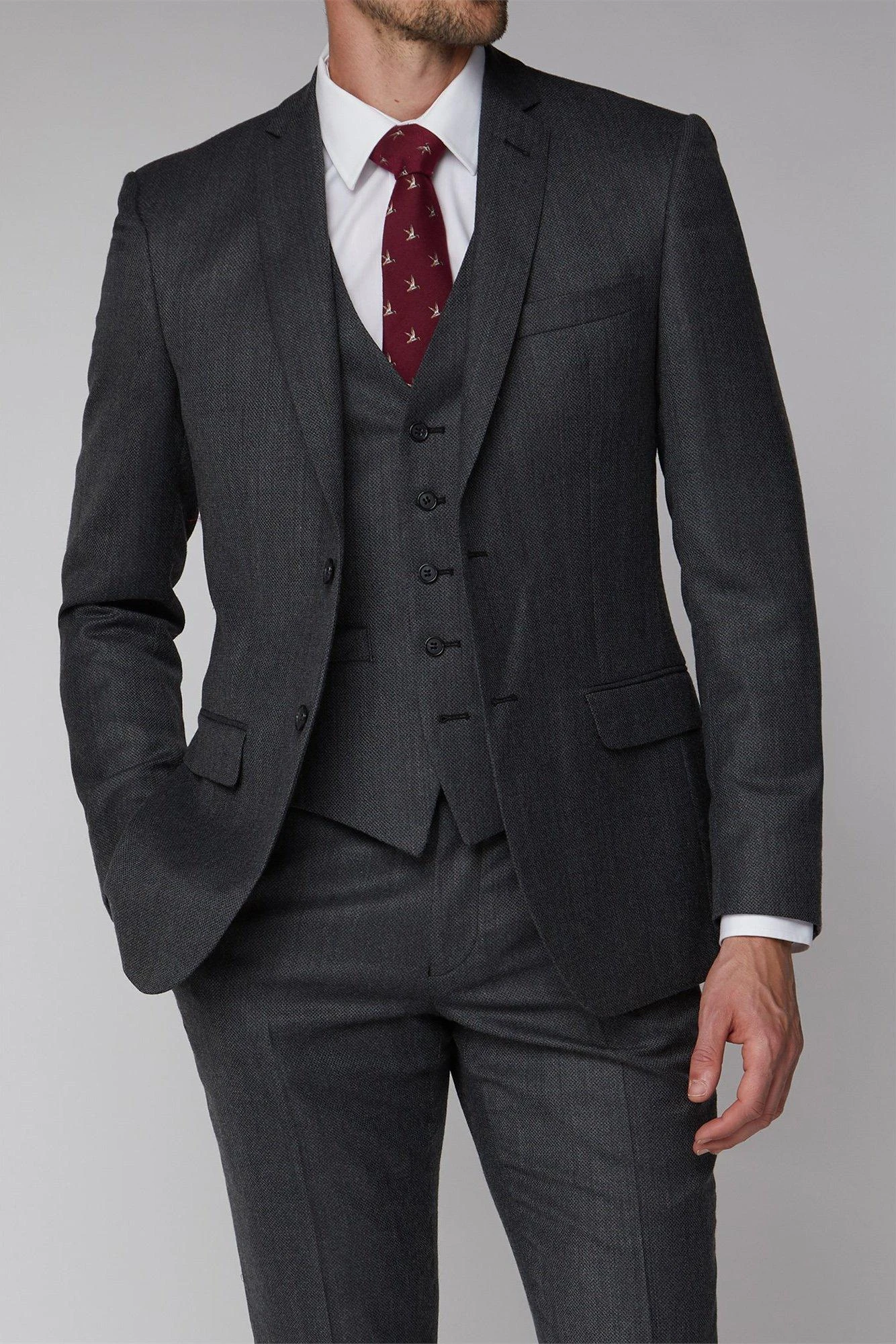 Texture Tailored Suit Jacket by Racing Green. This textured suit by Racing Green is a stylish wool blend suit for any occasion. With notch lapels, a two button fastening and a tailored fit, this men’s suit jacket and trousers makes up the perfect wardrobe for any occasion, inspired by a true best of British profile. Ideal for a man on the go, the Racing Green collection is based upon performance. Durability, stylish cuts and a fine, tailored fit make the name a legend in contemporary, subtle suits that are ideal to make an impression – inspired by classic best of British menswear for a heritage profile.