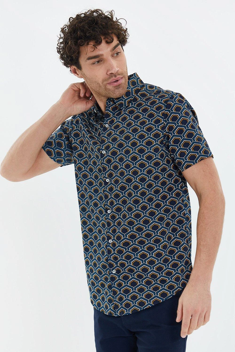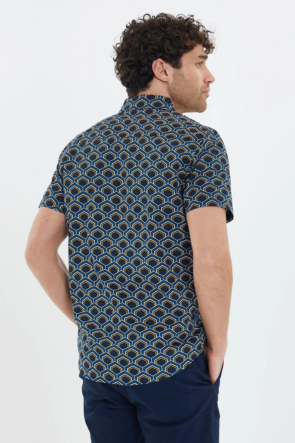 This short sleeve, geometric print shirt from Threadbare is made in a cotton fabric and designed in a regular fit. A must have style for every wardrobe this season. Team with shorts or chinos to complete the look. Other colours available.