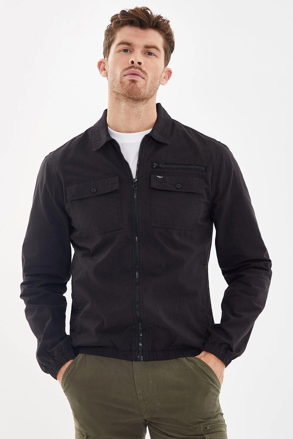 Complete your look with this smart and stylish zip up shacket from Threadbare. Finished with twin stitched collar and shoulder seams, this shirt and jacket hybrid has a zip fastening, zip detail to the chest and two button up chest pockets. This shacket also has two side pockets, elasticated cuffs and elasticated hem. Team with a T-shirt and chinos or jeans for a fashionable, everyday outfit. Other colours available.