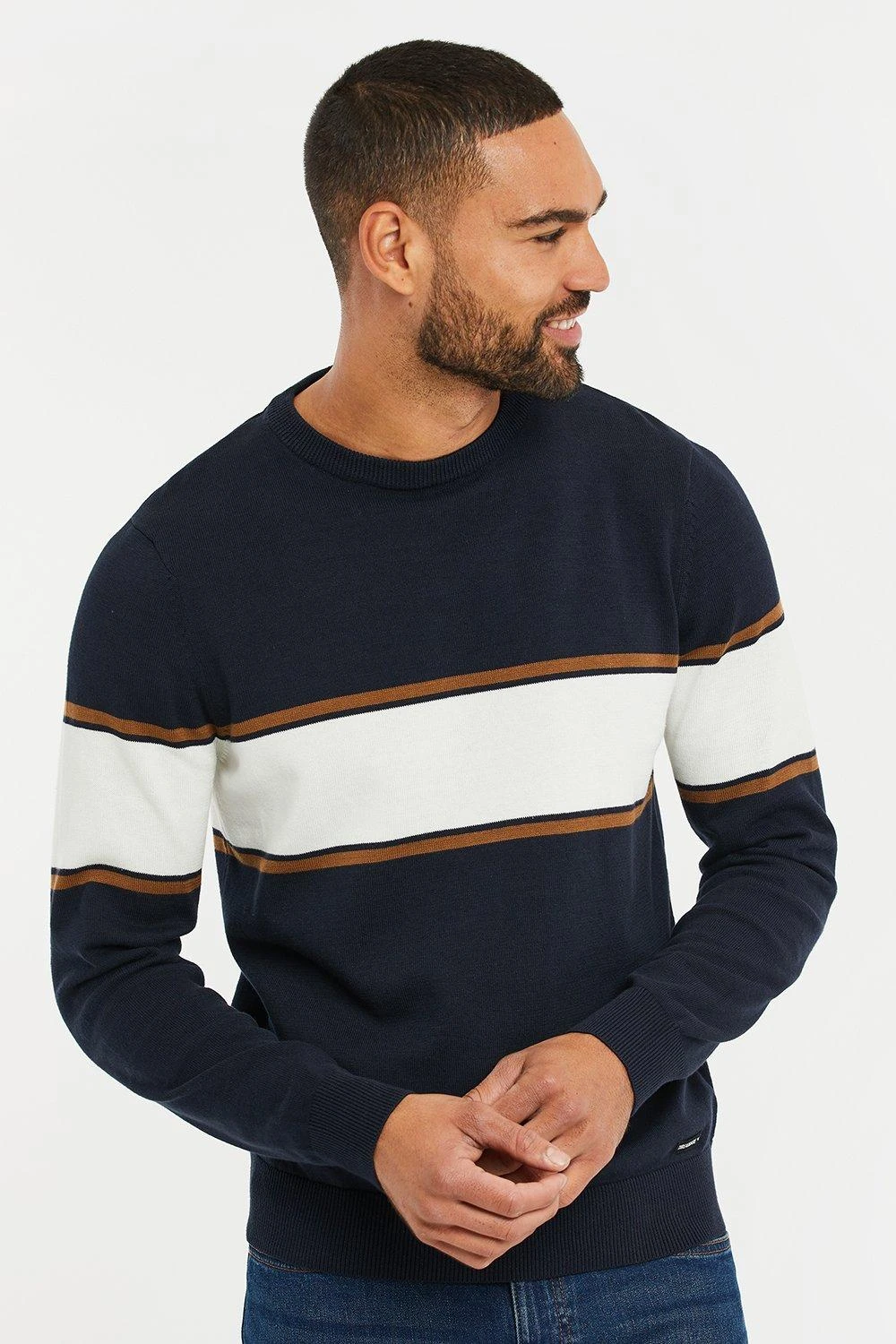 This fine knit jumper from Threadbare features a striped colourblock design across the chest. Made in a soft cotton yarn for comfort, this versatile piece has a classic crew neck, ribbed cuffs and hem and is perfect with jeans or chinos.