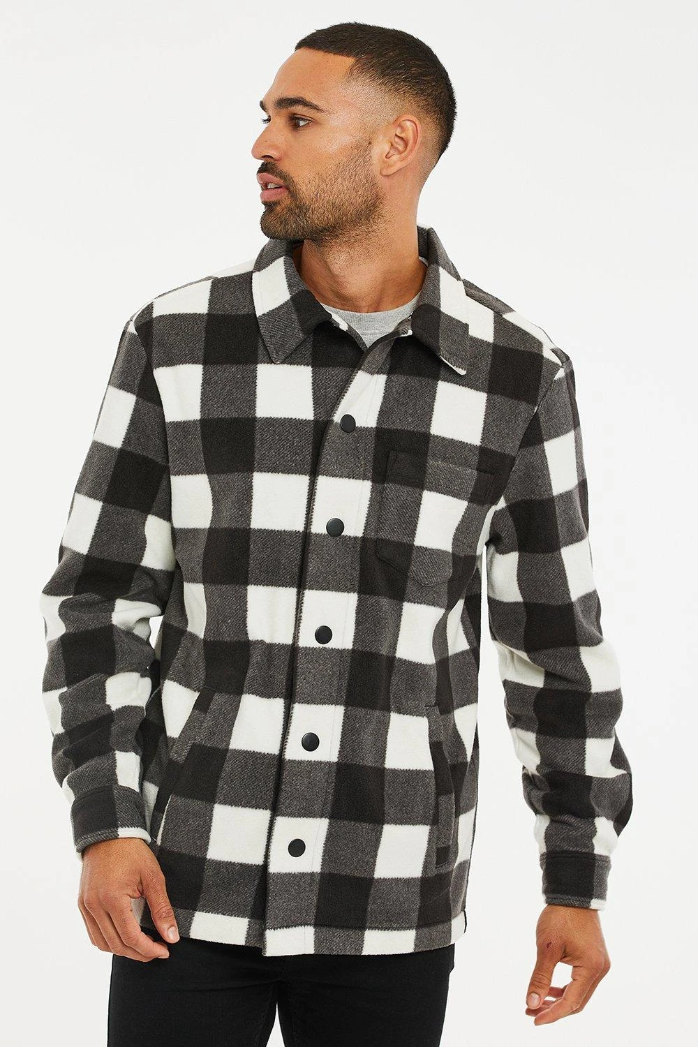 This button through borg shacket from Threadbare comes in a check design and features a collared neck, two side pockets and a chest pocket for added detail. Team with jeans and a long sleeve tee for a relaxed weekend look.