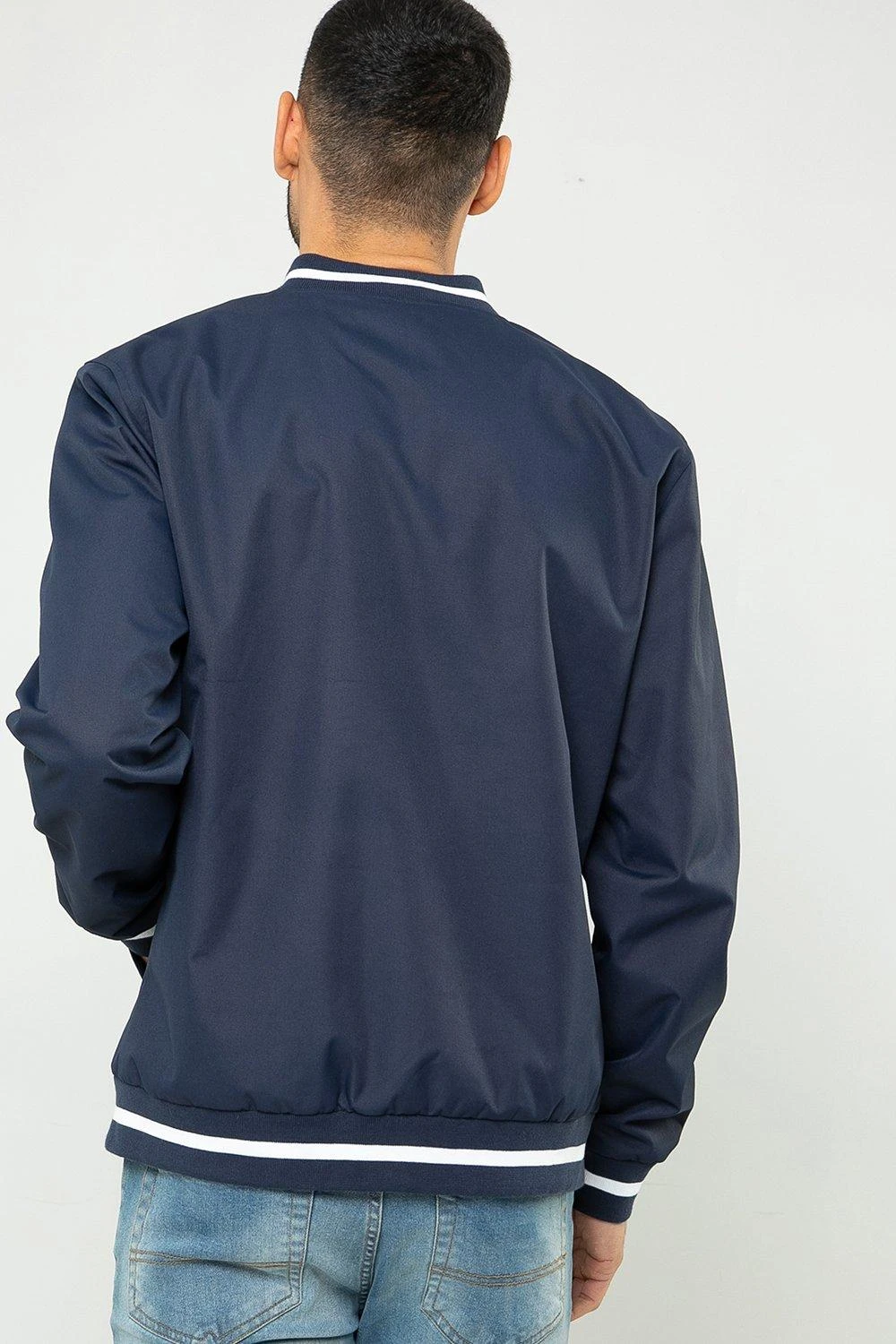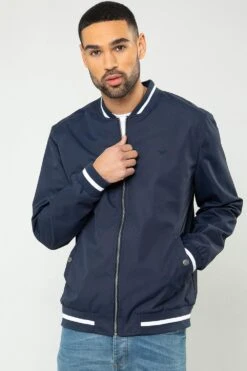 This bomber jacket from Threadbare comes with 2 front pockets with popper fastening along with an inner pocket. This style is finished with a striped ribbed collar, hem and cuffs.