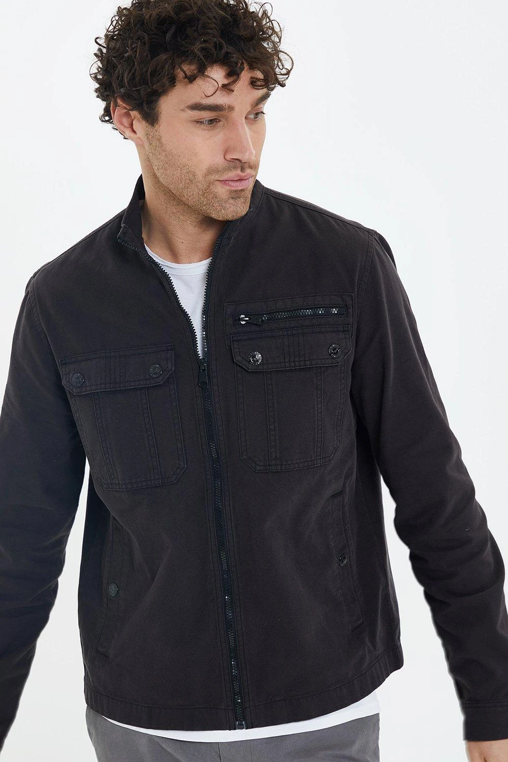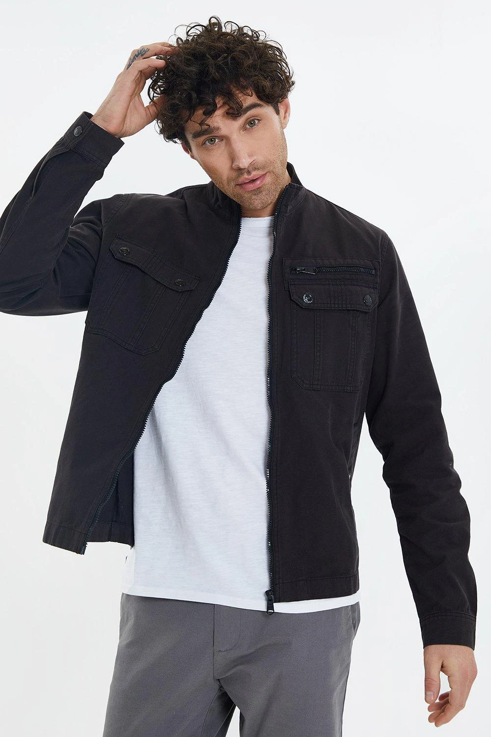 Finish your look with this smart and stylish zip up shacket. Complete with funnel neck collar and shoulder seams, this biker-inspired lightweight jacket has a zip fastening, zip detail to the chest and two flap chest pockets with press studs. It also features two side pockets with press studs, and adjustable press stud cuffs. Other colours available.