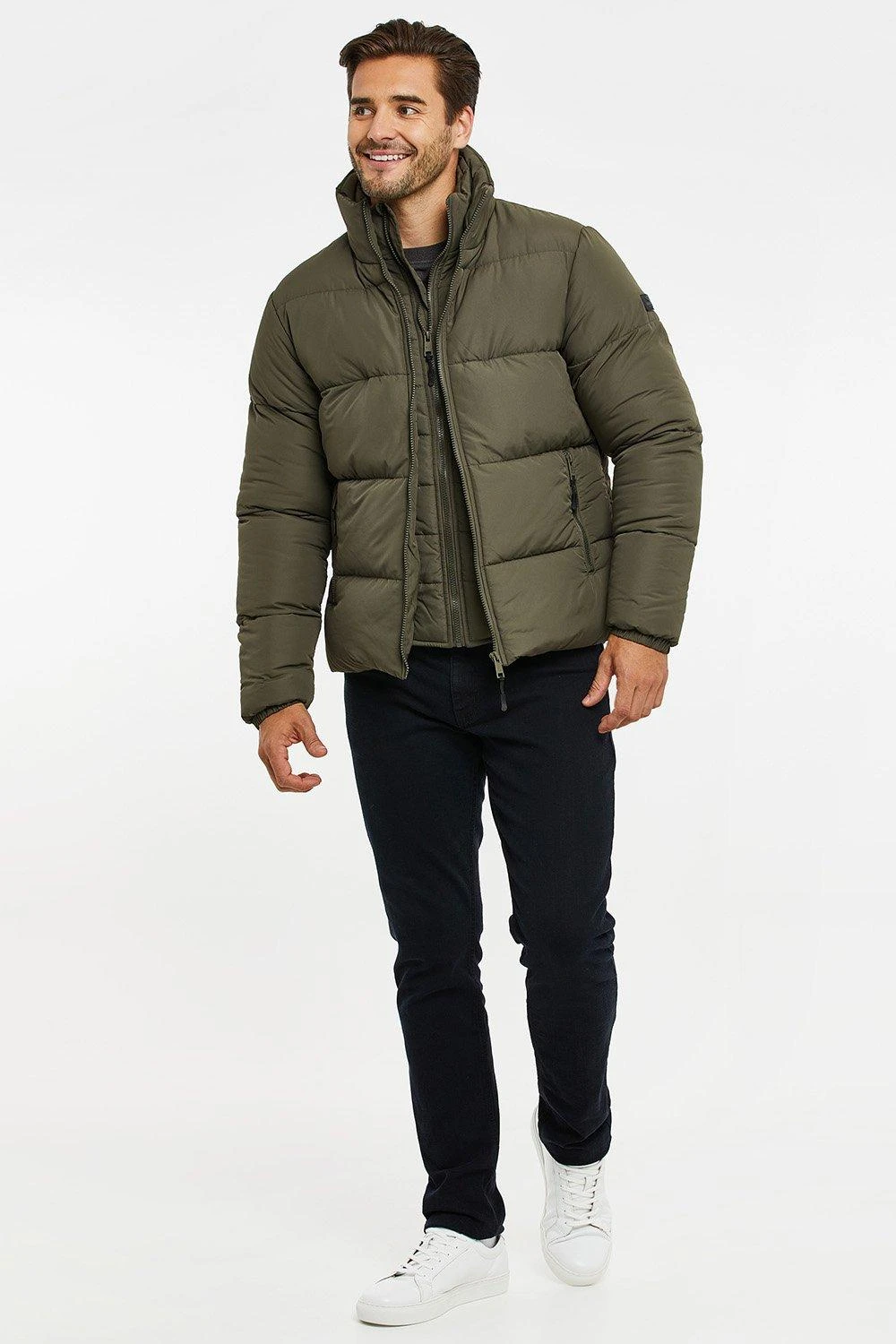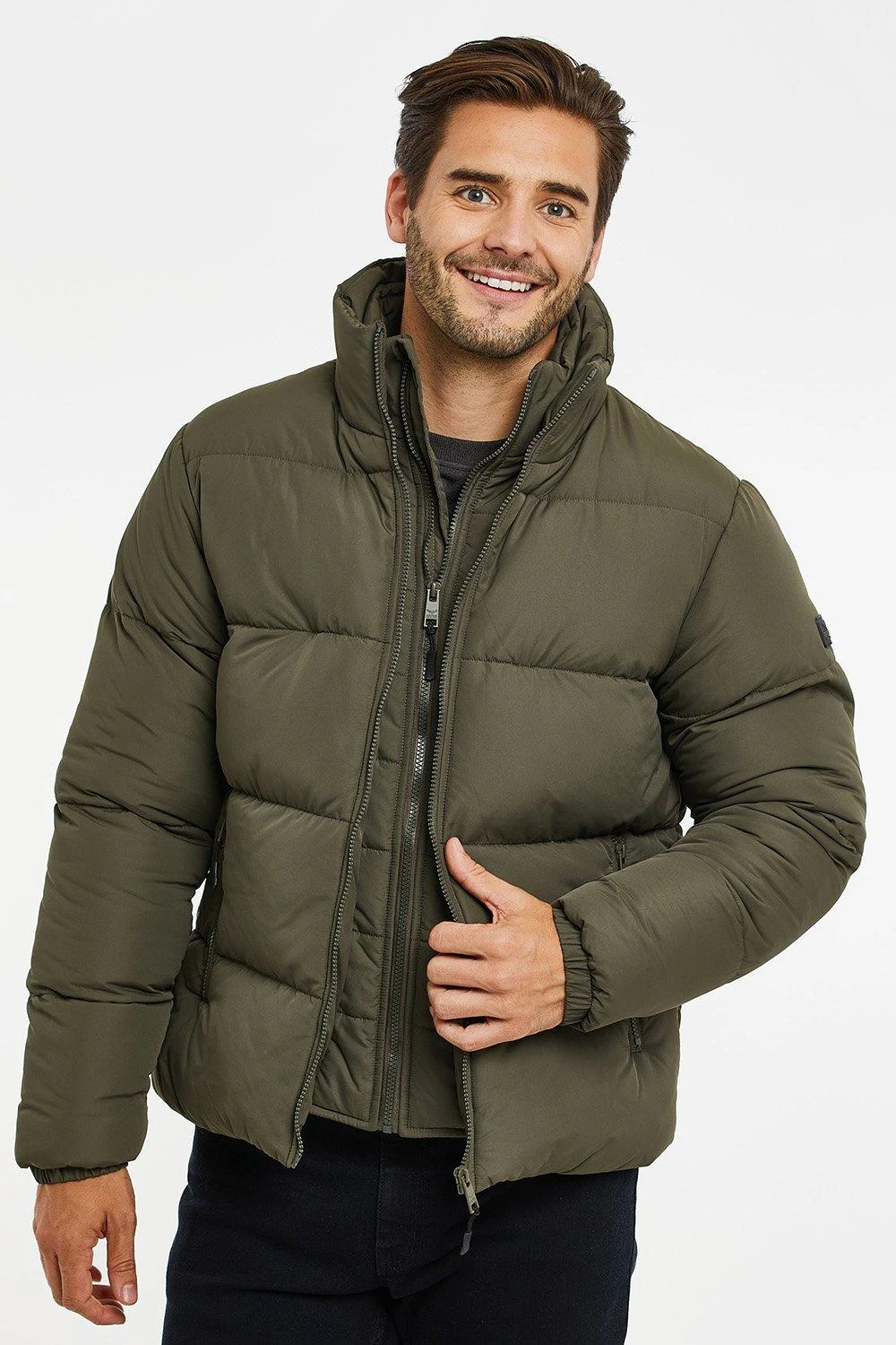 Update your outerwear with this puffer jacket from Threadbare with an attached mock under layer. This puffer jacket has a high funnel neck and the attached zip up mock layer adds functionality without needing to wear a thicker layer underneath. There are two side entry front pockets and this style is finished with the Threadbare badge on the sleeve.