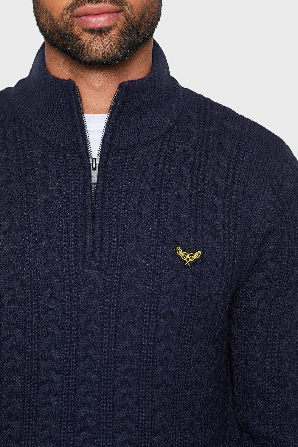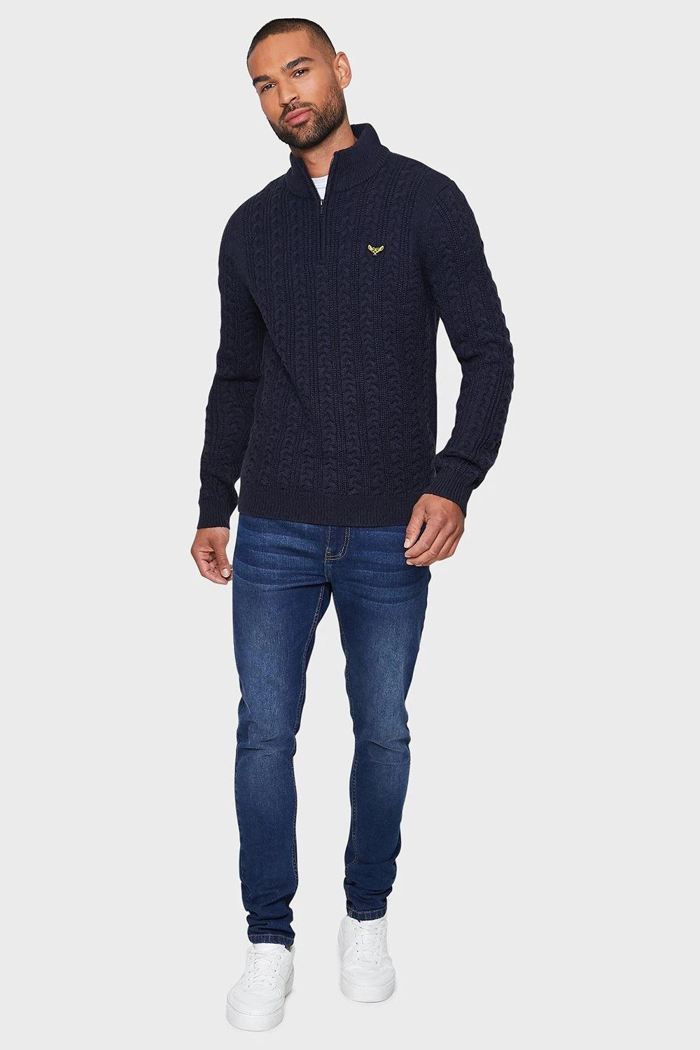 This cable knit jumper from Threadbare features a 1/4 zip, ribbed funnel neck, embroidered logo on chest and ribbed cuffs and hem. Made from soft yarn for comfort, this style is ideal to keep you warm this season. Other styles and colours available.