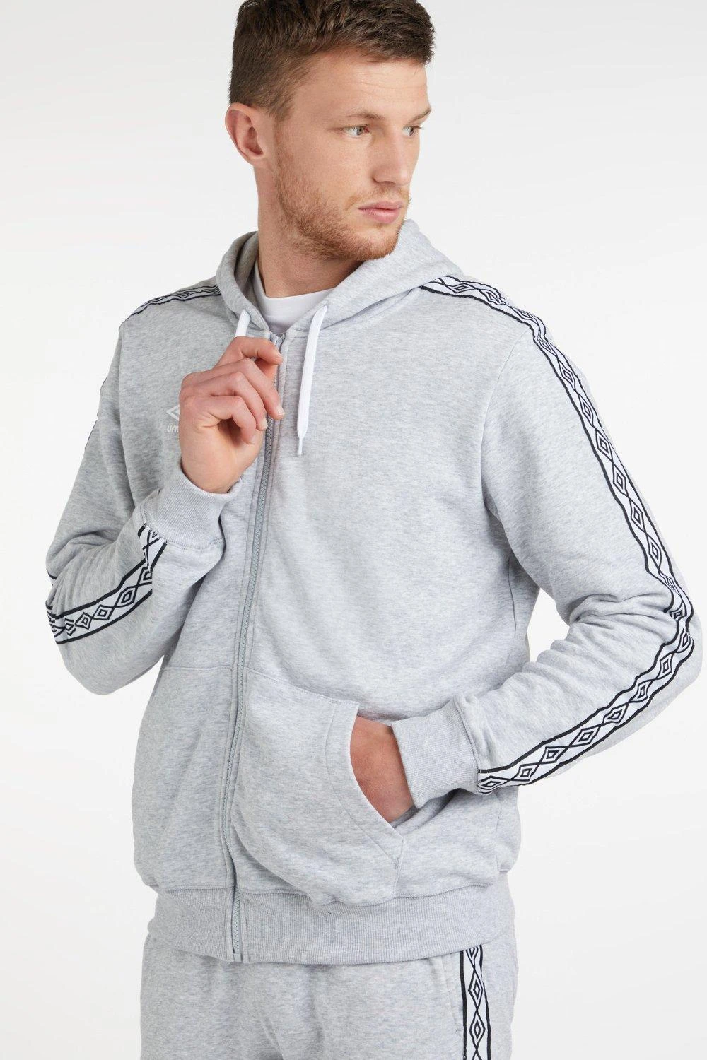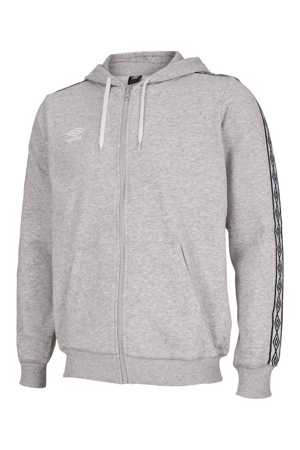The Umbro Loopback Taped Zip Hoodie is a stylish and functional outerwear piece. It features contrast branded taping on the shoulders and sleeves, adding a touch of sporty detailing. The hood is equipped with a drawcord, allowing you to adjust the fit for added comfort. The kangaroo pocket offers a convenient storage option for your essentials. With ribbed cuffs and hem, this hoodie provides a snug and secure fit.